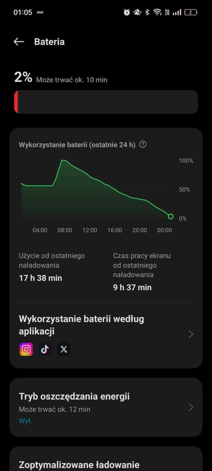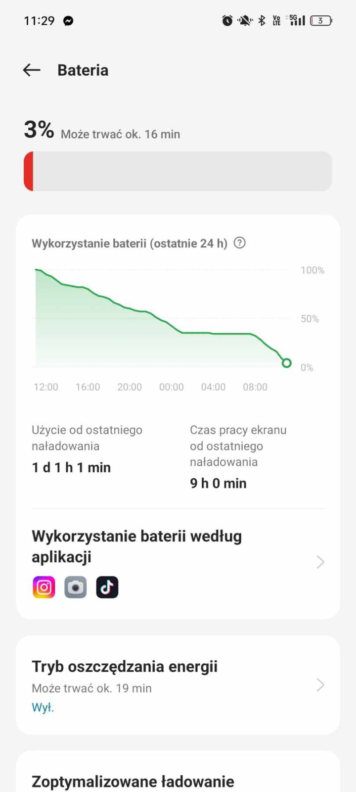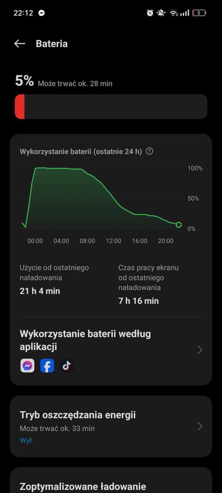 Gdy czyta się specyfikacje niemal wszystkich smartfonów z niższej i średniej półki, w oczy rzuca się jeden element – to akumulator o pojemności 5000 mAh. Nie inaczej jest w przypadku Oppo A79 5G. Mieć duży akumulator to jedno, a wycisnąć z niego czasy pracy rzędu 7 godzin na LTE/5G i ponad 9, a czasem nawet 10 godzin przy Wi-Fi, to już nie lada wyczyn. Oppo znakomicie zoptymalizowało system (także przez wyłączanie procesów w tle), przez co bez problemu da się pracować ze smartfonem przez dwa, a nawet trzy dni. Przy oglądaniu Youtube przez godzinę na Wi-Fi i z głośnością 50% z licznika ubyło zaledwie 7% pojemności.