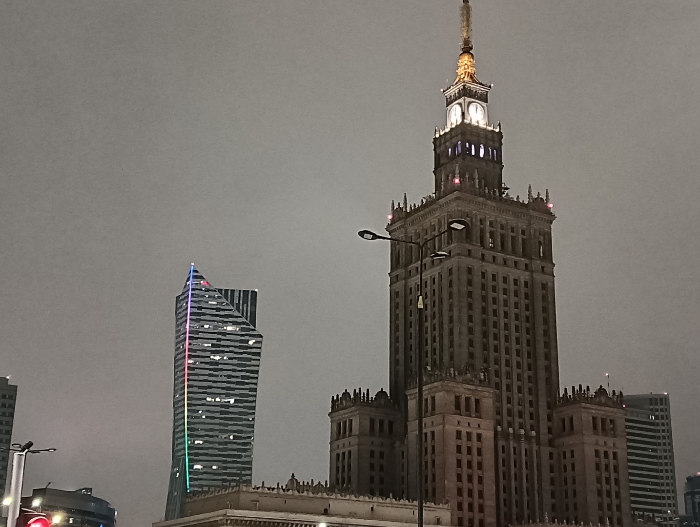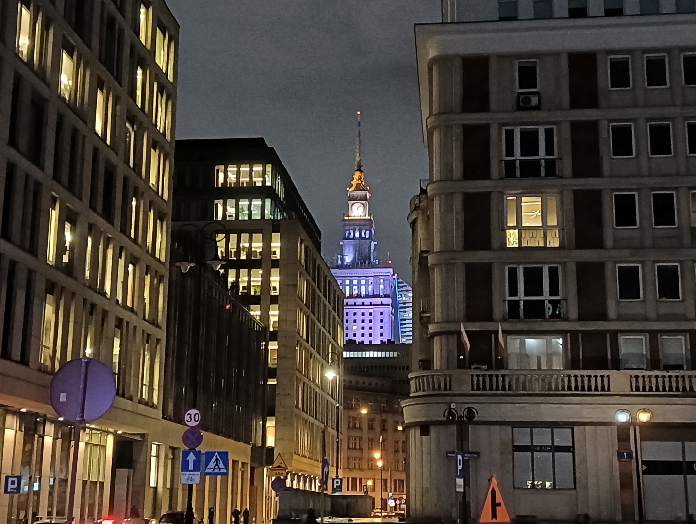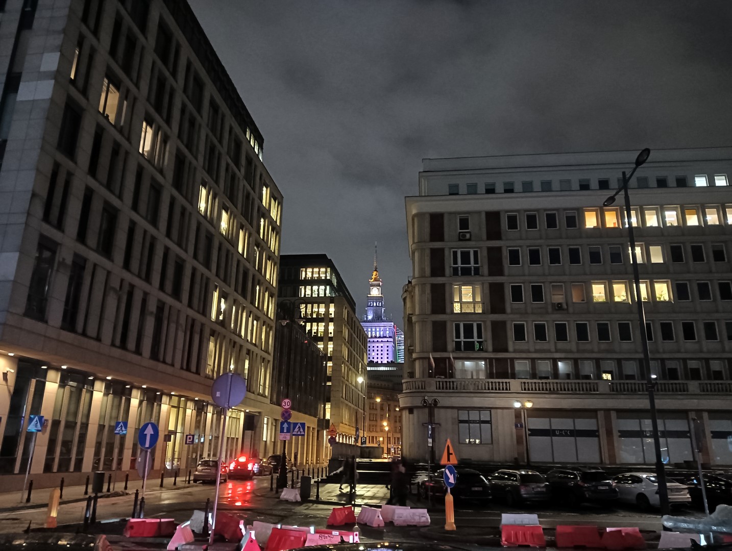 Nocą zdjęcia mają już zdecydowanie mniej detali, ale na plus warto odnotować przyzwoicie działający tryb nocny. Rozjaśnia kadr w ciemnych miejscach i powstrzymuje nadmierną eskpozycję w punktach świetlnych. Te potrafią się rozbłyskiwać na zauważalną część kadru, ale nie przeszkadzają w odbiorze zdjęcia. Kolorystyka całkiem dobrze oddaje to, co widzi oko. Jednocześnie nocą jest już sporo ziarna i nawet w kategorii do 1000 zł nie jest to coś nadzwyczajnego. Widoczne są próby mocnego wyostrzania i nadawania wyrazu konturom budynków. Rozpiętość tonalna jest w porządku, ale raczej nie porywajcie się z telefonem na miejsca, gdzie zupełnie brakuje źródeł światła.