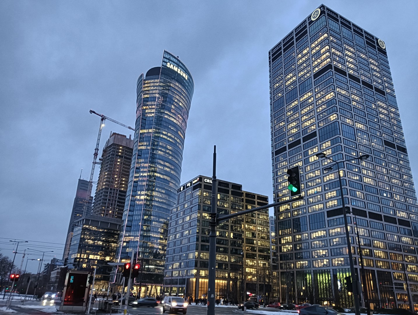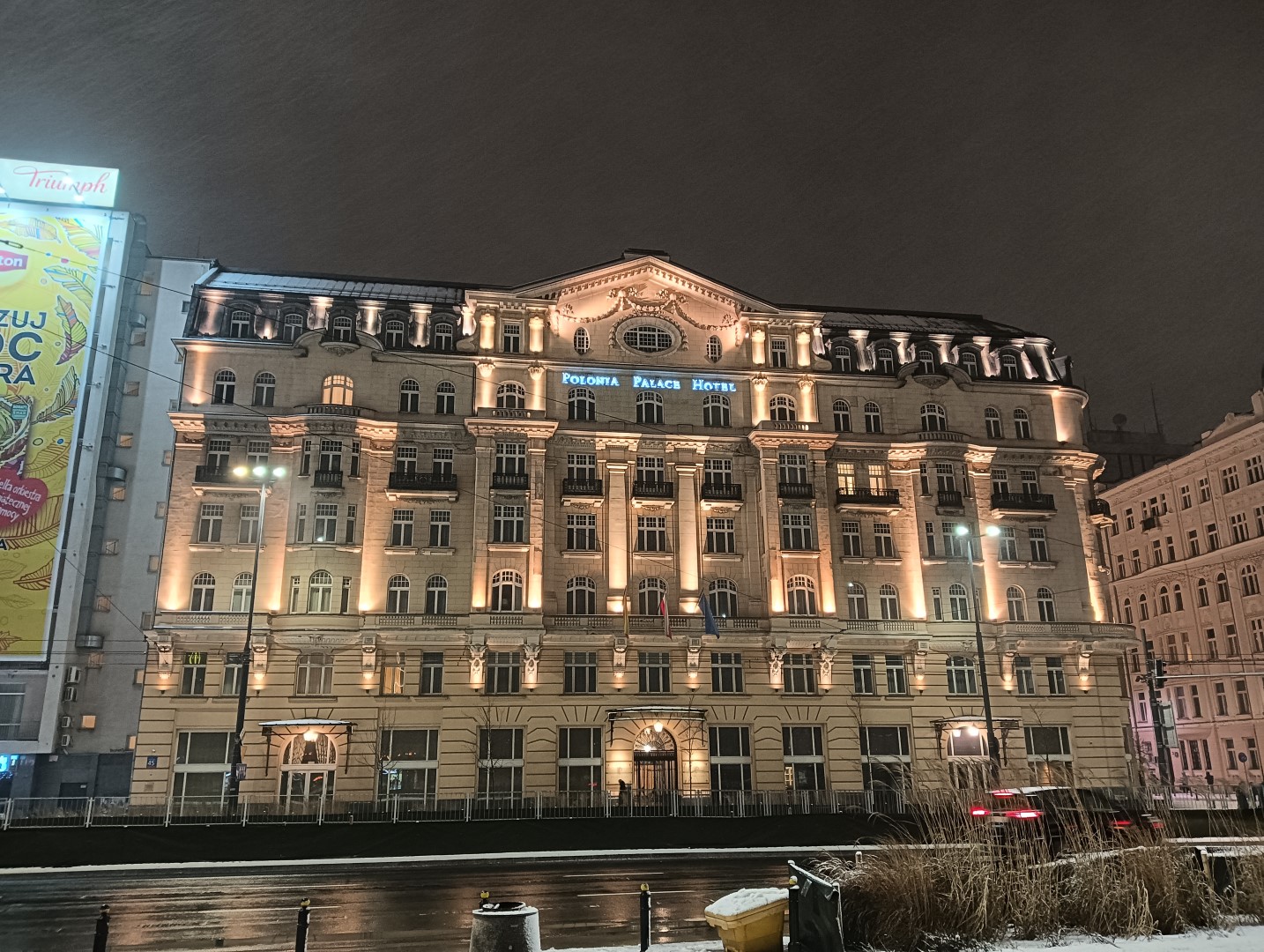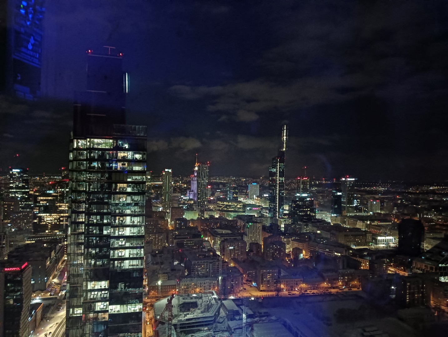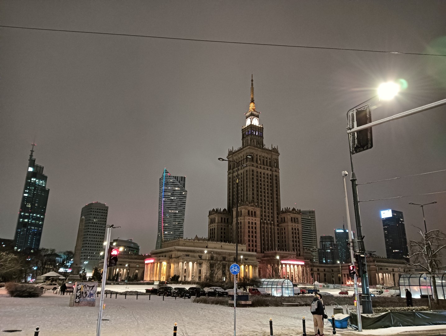 Nocą zdjęcia mają już zdecydowanie mniej detali, ale na plus warto odnotować przyzwoicie działający tryb nocny. Rozjaśnia kadr w ciemnych miejscach i powstrzymuje nadmierną eskpozycję w punktach świetlnych. Te potrafią się rozbłyskiwać na zauważalną część kadru, ale nie przeszkadzają w odbiorze zdjęcia. Kolorystyka całkiem dobrze oddaje to, co widzi oko. Jednocześnie nocą jest już sporo ziarna i nawet w kategorii do 1000 zł nie jest to coś nadzwyczajnego. Widoczne są próby mocnego wyostrzania i nadawania wyrazu konturom budynków. Rozpiętość tonalna jest w porządku, ale raczej nie porywajcie się z telefonem na miejsca, gdzie zupełnie brakuje źródeł światła.