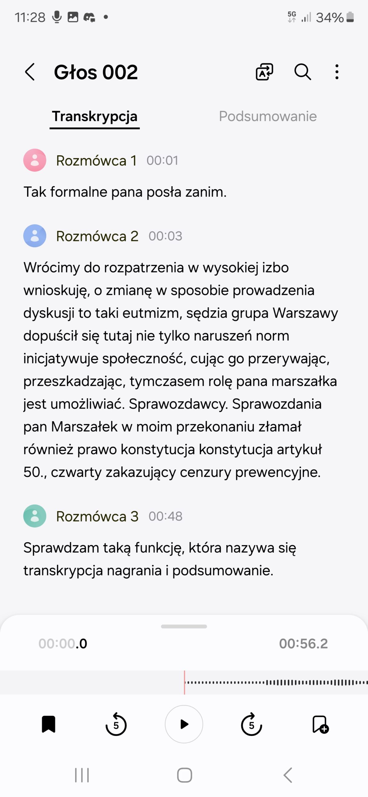 Galaxy AI niestety zawodzi także, jeśli chodzi o rozpoznawanie głosu, o czym przekonałem się, oglądając wyniki w tłumaczu tekstowym i aplikacji dyktafon. Do w miarę prawidłowego działania potrzebne są idealne warunki, cisza i brak zakłóceń, które w realnym życiu są raczej częste. Próba transkrypcji fragmentu obrad sejmowych odtworzonego z Youtube się powiodła o tyle, że rozpoznało unikalne głosy każdego z mówców, ale to, co wygadywali wg Galaxy AI, niewiele miało wspólnego z rzeczywistością. Niestety nie wróży to dobrze wszelkim próbom nagrywania wykładów na uczelniach – na salach wykładowych warunki będą na pewno gorsze.