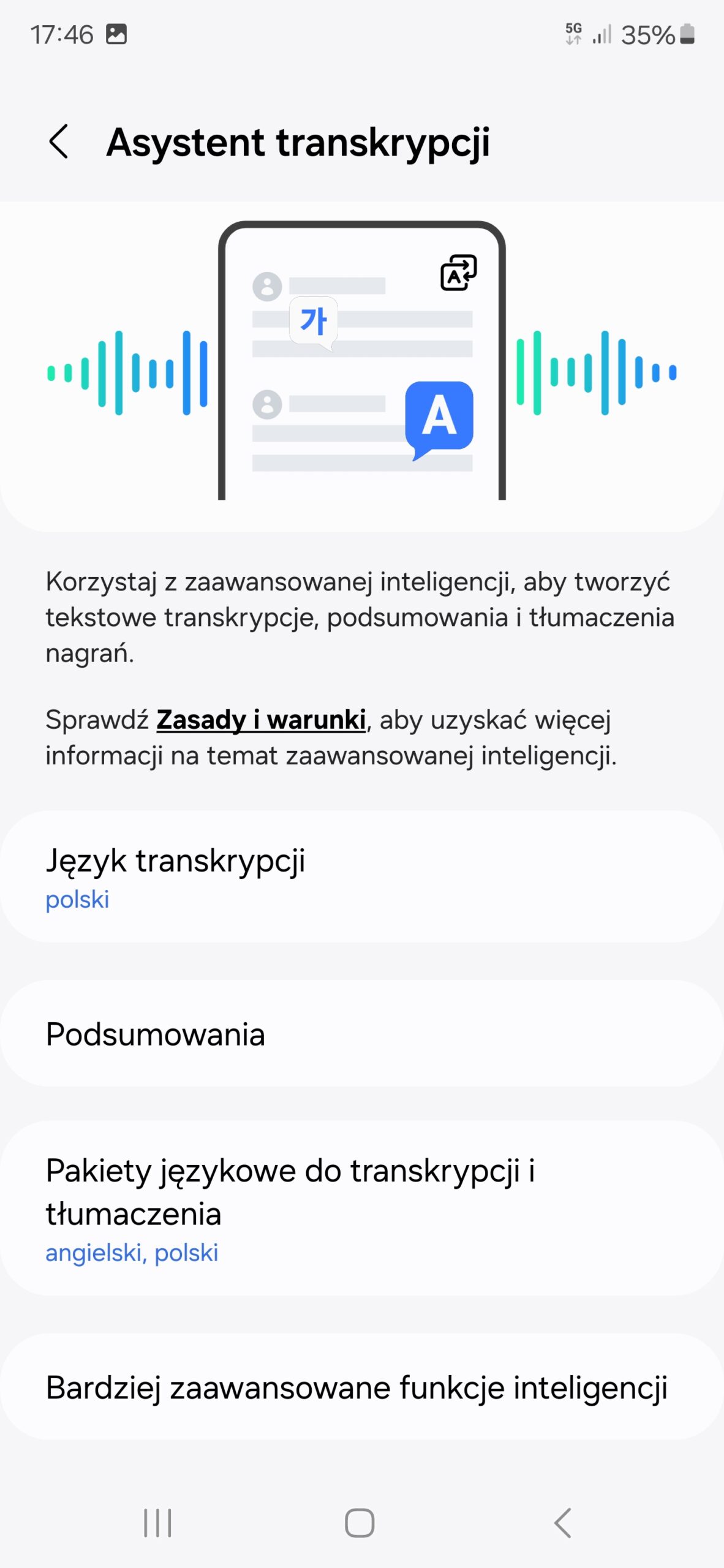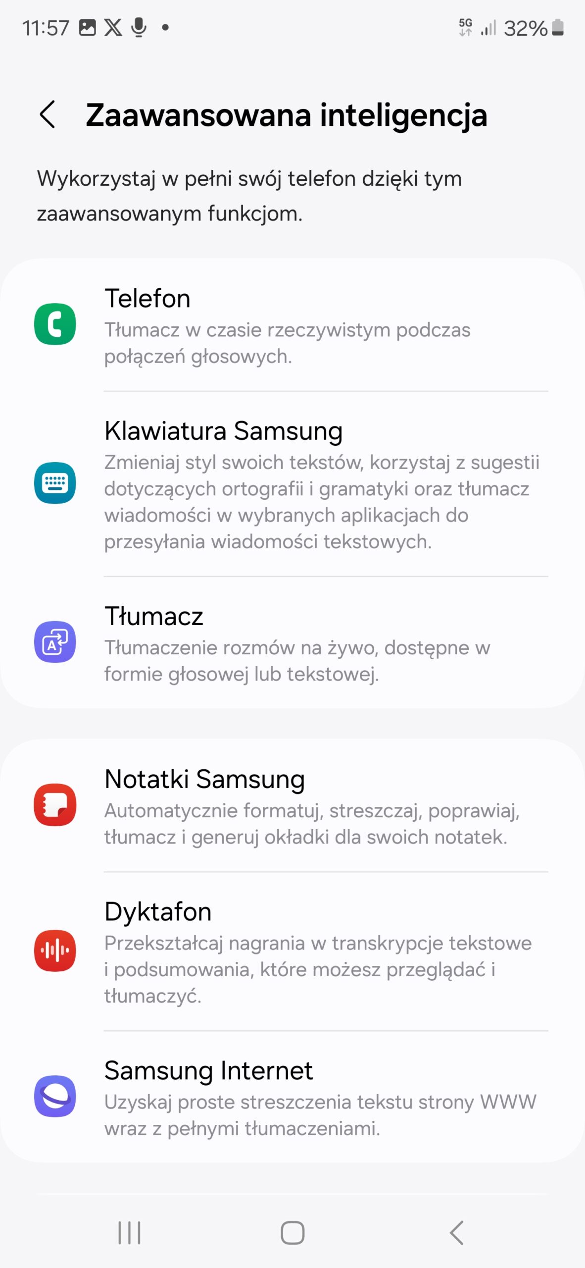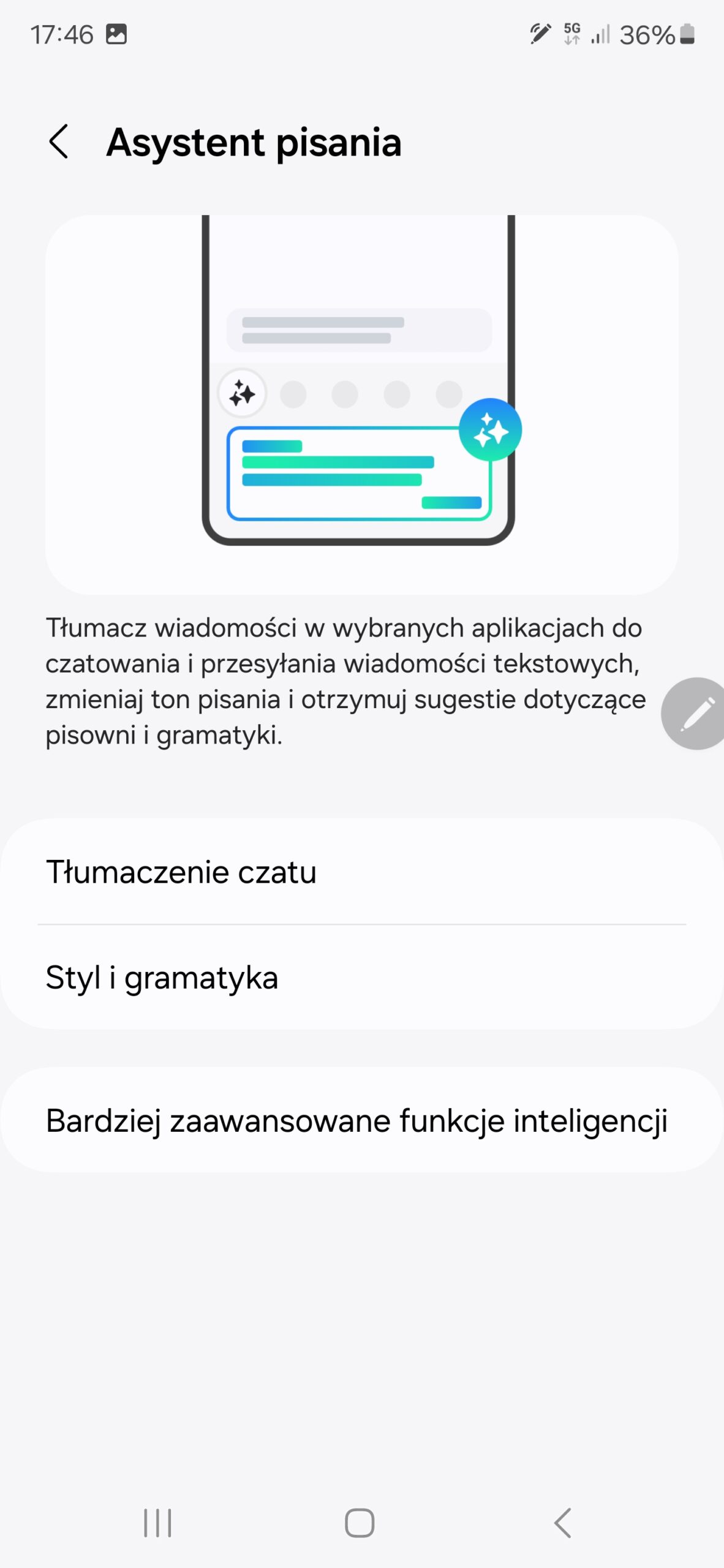 Wracając jednak do samej Galaxy AI, to jest tak naprawdę zestaw funkcji, które producent nazwał w menu „zaawansowaną inteligencją”. Dla zachowania przejrzystości opiszę je na początek punkt po punkcie, tak, jak widnieją one w menu ustawień: