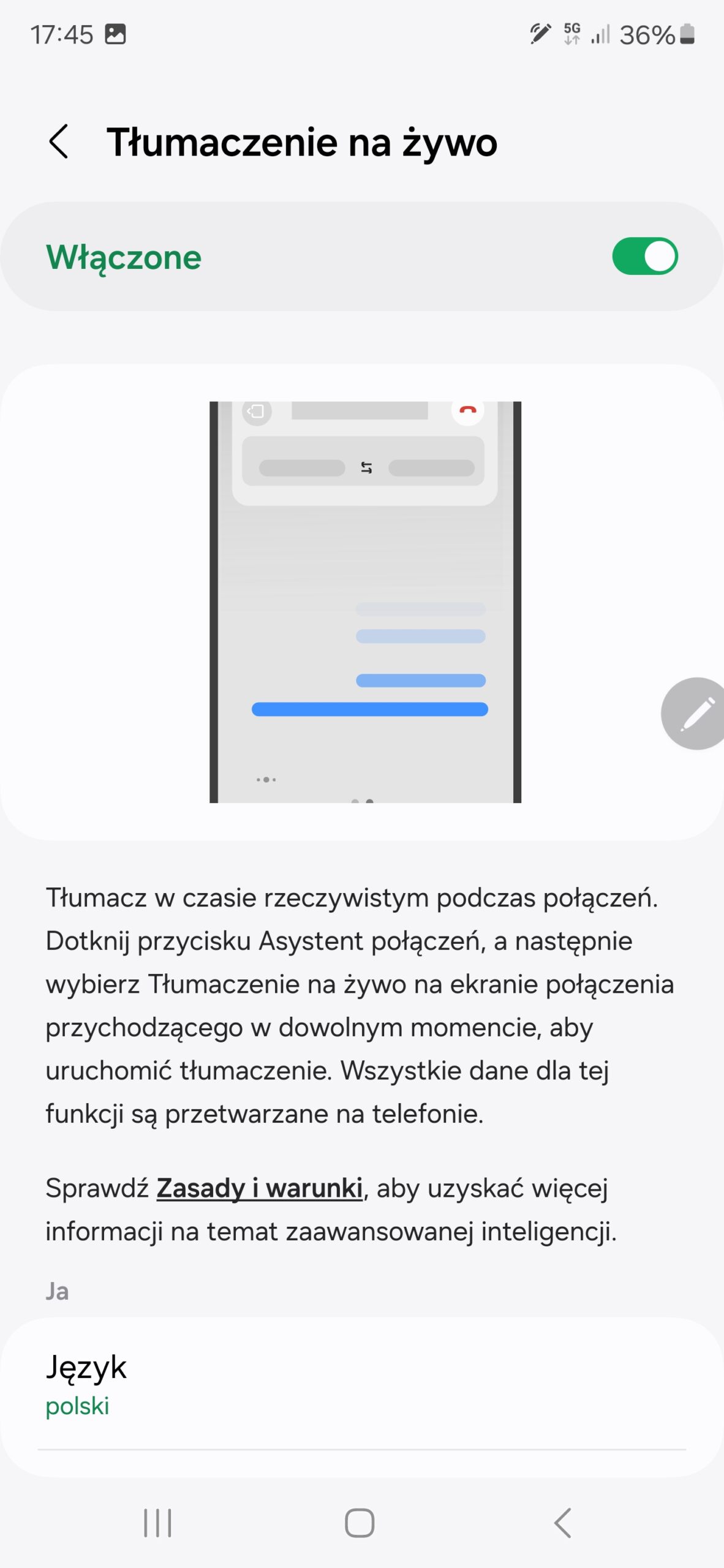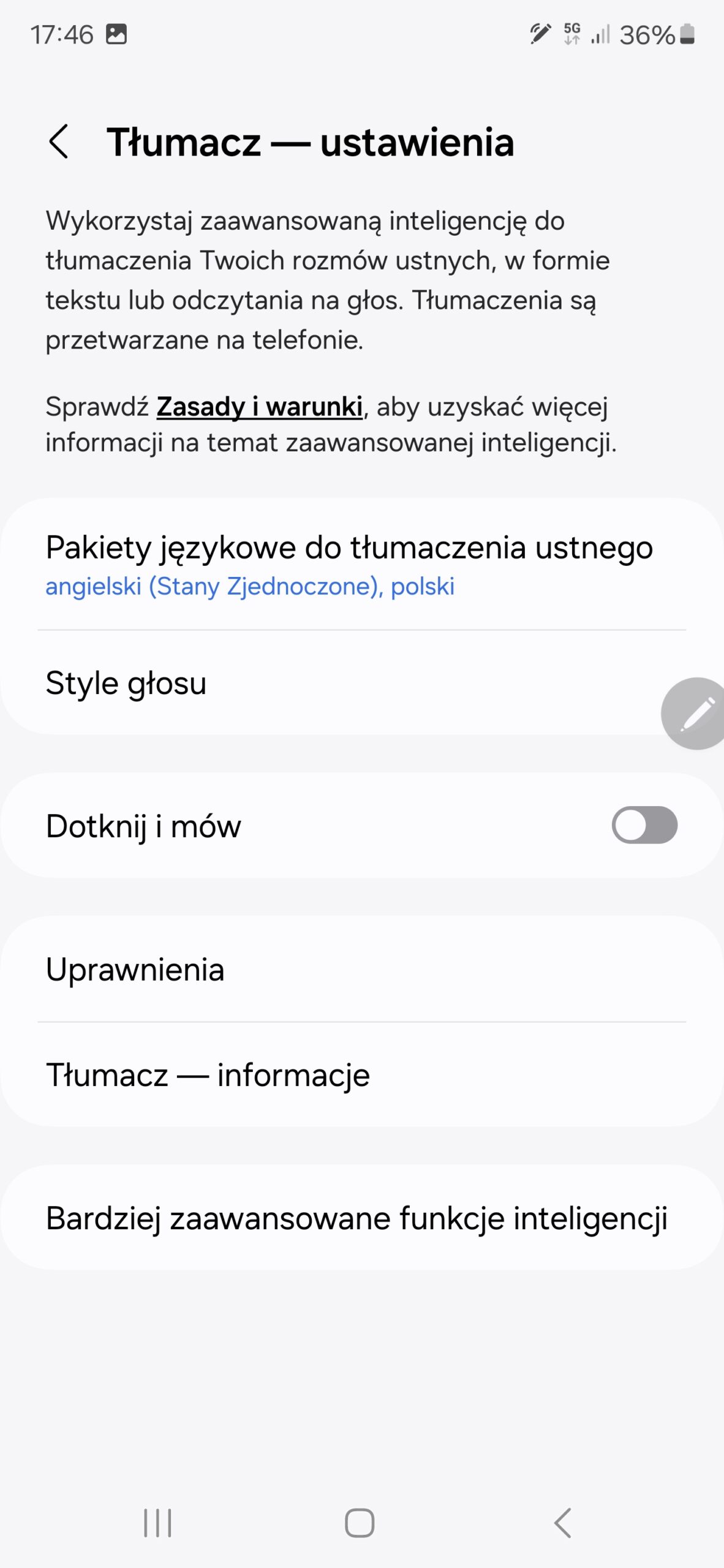 - Telefon (tłumacz w czasie rzeczywistym połączeń głosowych). Ma za zadanie tłumaczyć „na żywo” połączenia telefoniczne. Możemy wybrać jeden z 13 obsługiwanych języków (w tym polski) oraz wybrać, czy ma być tłumaczy w sposób tekstowy, czy głosowy. Założenie jest super, niestety działanie pozostawia wiele do życzenia. Często pojawiają się błędy nie tylko w samym tłumaczeniu (to byłoby do zaakceptowania), ale też w identyfikacji wypowiadanych słów. Co więcej, tłumacz czasami sam z siebie potrafi dodawać jakieś niezrozumiałe zdania do dialogu.