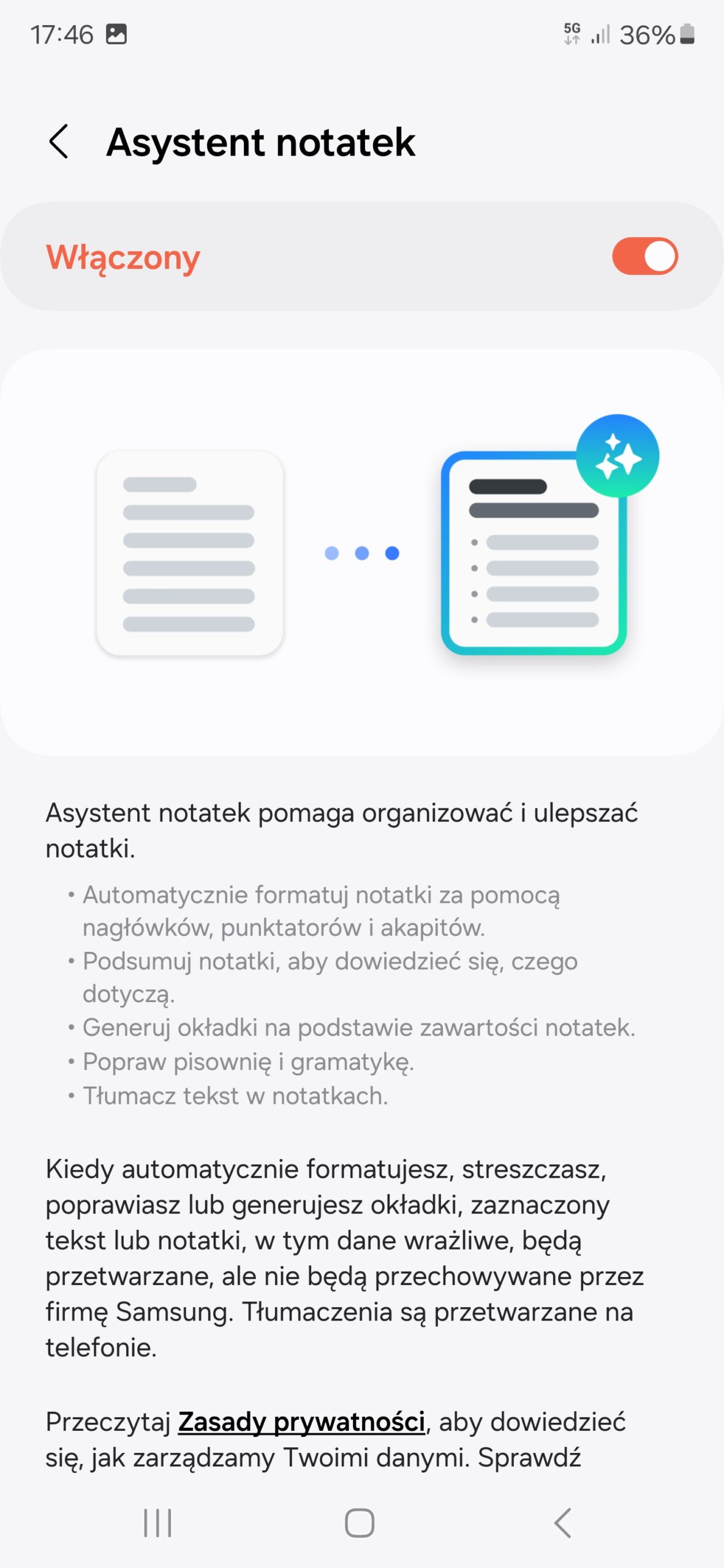 - Notatki Samsung (automatyczne formatowanie notatek, tworzenie podsumowań, tłumaczenie, poprawianie pisowni i gramatyki i generowanie okładek na podstawie notatek). Wszystko działa dobrze, poza generowaniem okładek na podstawie notatek. Tej funkcji nie udało mi się wywołać. Owszem, mogłem tworzyć okładki, ale obrazów na okładki generowanych przez AI nie uświadczyłem. Bardzo dobrze za to wypada poprawianie pisowni i tworzenie podsumowań notatek. Ta druga funkcja jest bardzo przydatna, zwłaszcza przy długich tekstach.