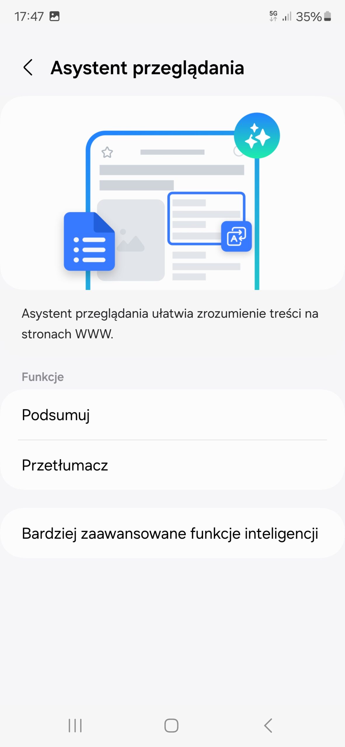 - Samsung Internet (podsumowania stron internetowych + ich tłumaczenie). Funkcja działa tylko w przeglądarce Samsunga, co trochę ogranicza, ale z drugiej strony ma też za zadanie promocję przeglądarki producenta. A skorzystać z niej warto, bo podsumowanie stron działa naprawdę bardzo dobrze i pomaga w szybkim zapoznaniu się z treścią zwłaszcza długich artykułów. Tu duży plus dla Samsunga.