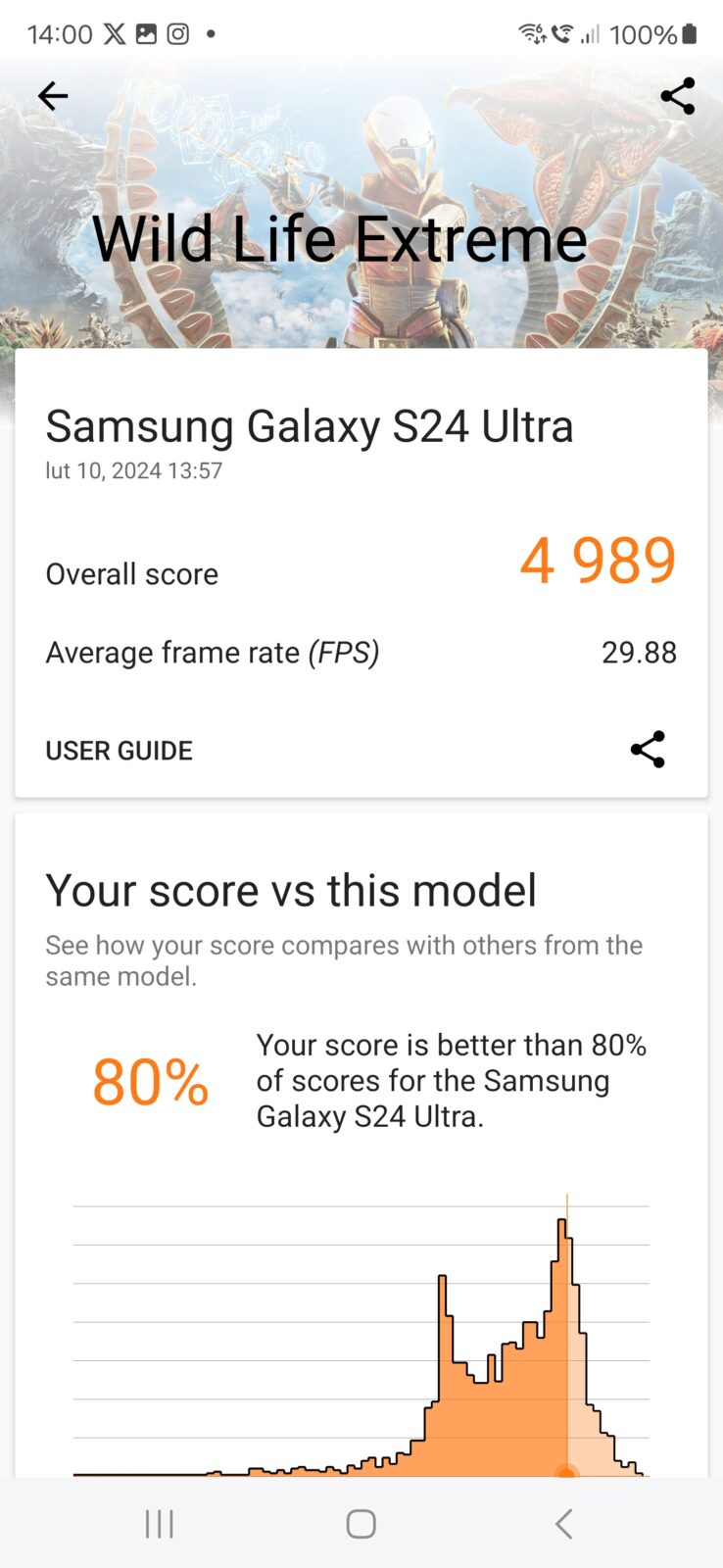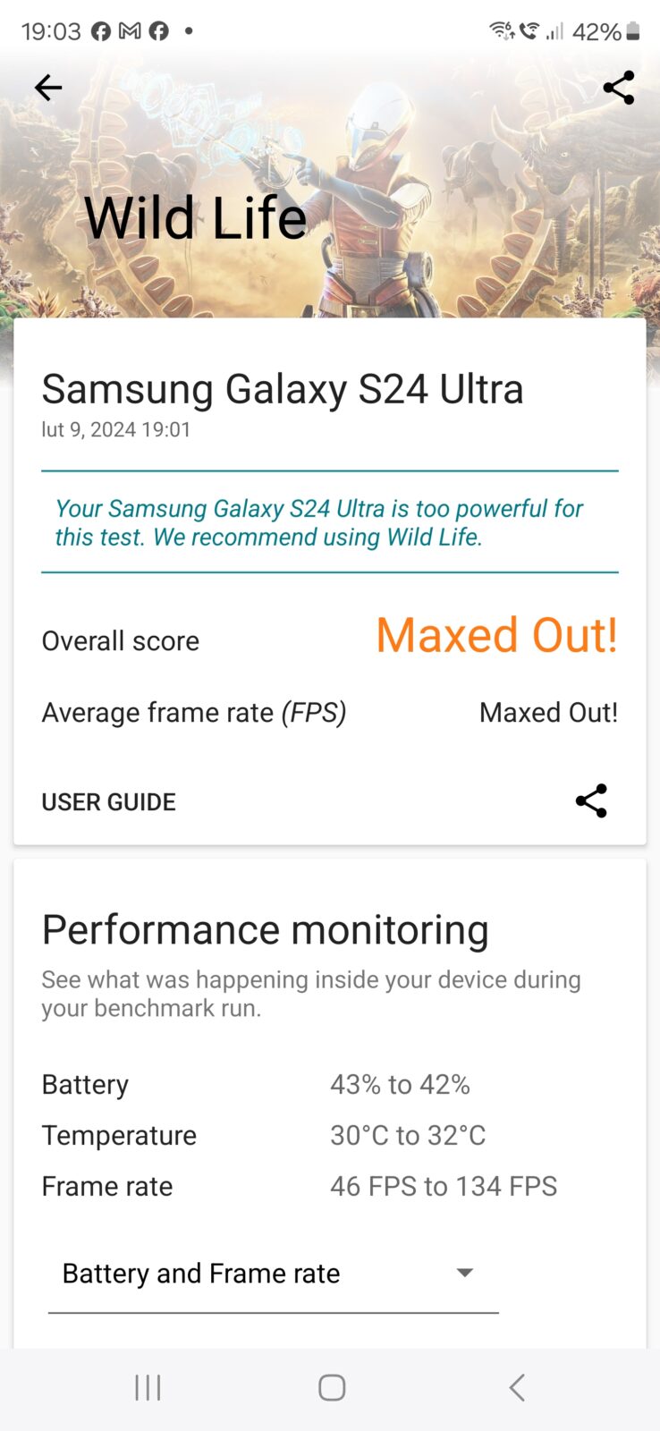 W testach obciążeniowych S24 Ultra wypada słabo, ale przewidywalnie. Smartfon silnie się rozgrzewa pod obciążeniem, najwyższa temperatura, jaką zarejestrowałem na obudowie za pomocą termometru IR wyniosła 45,5° w pobliżu wyspy aparatów. Obniżenie wydajności do połowy pod wpływem temperatury to coś, do czego powinniśmy się już w topowych smartfonach przyzwyczaić.