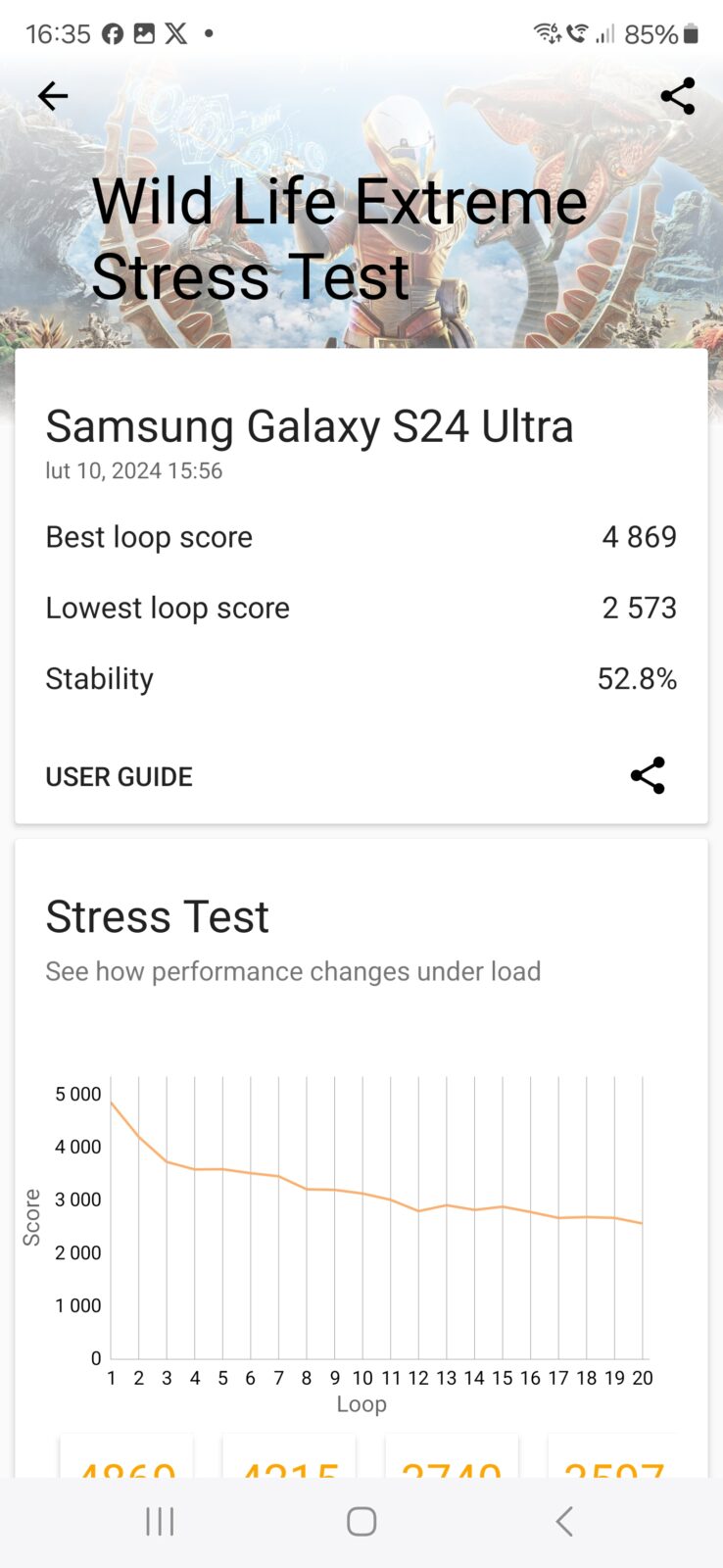 - Wild Life Extreme Stress Test: 4869/2573 pkt, stabilność 52,8%