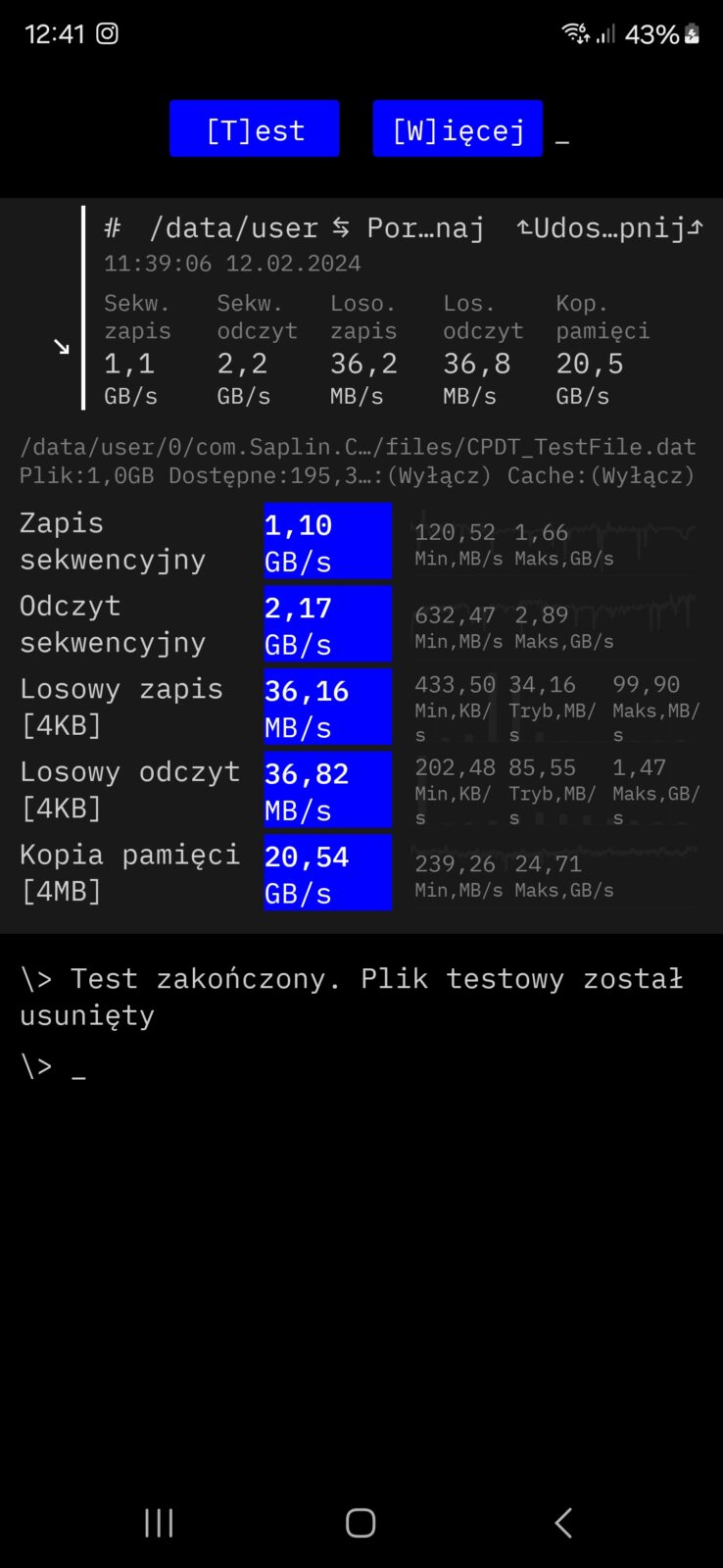 Test wydajności pamięci flash nie pozostawia złudzeń – Samsung na tym elemencie nie oszczędzał i jest naprawdę szybko – tak szybko, że podobnych wyników jeszcze nie widziałem.