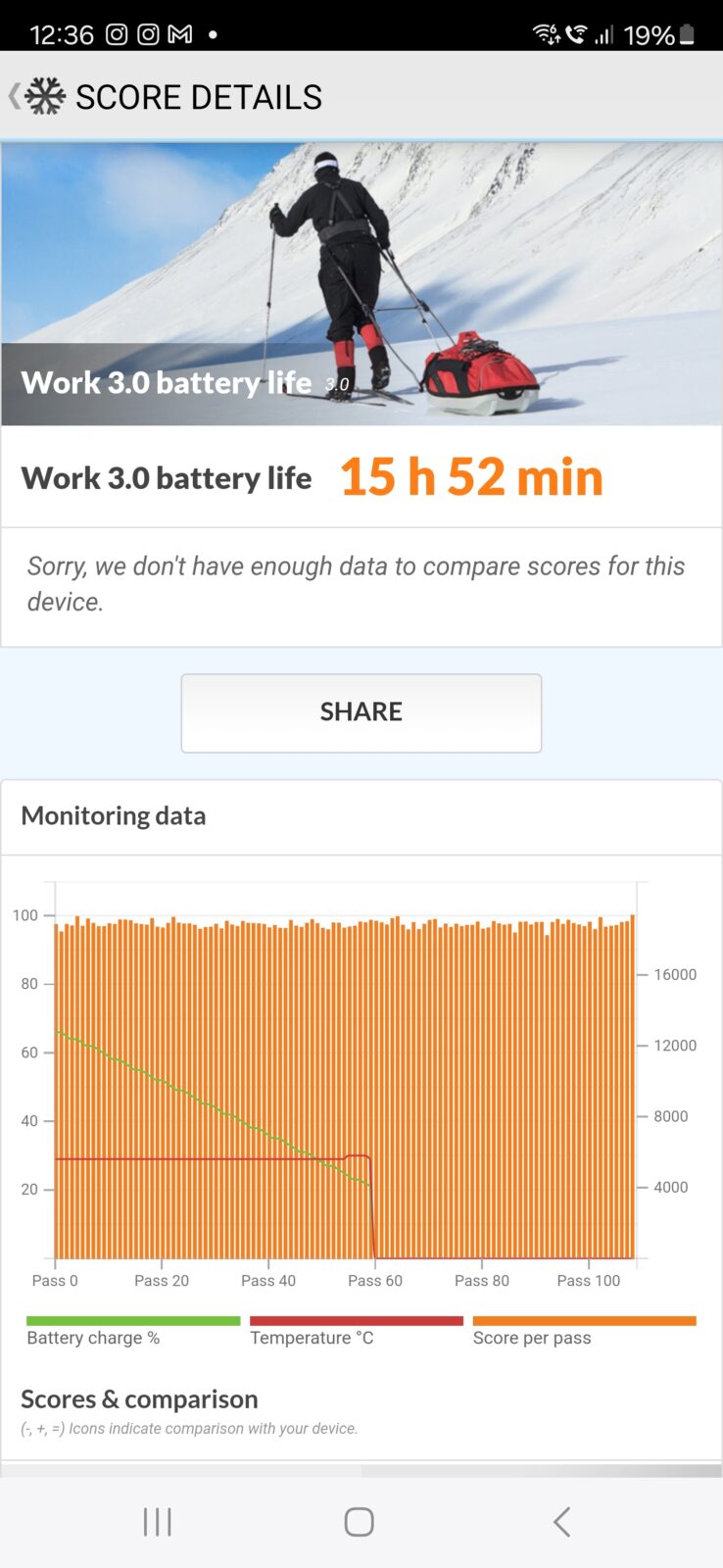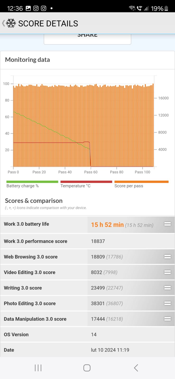 S24 Ultra otrzymał akumulator Li-Ion o pojemności 5000 mAh, który w teście PCMark Battery pozwolił uzyskać znakomity wynik 15 godzin i 52 minuty od 100% do 20%. Praktyczna ocena żywotności telefonu jest znacznie trudniejsza, nie jestem bowiem w stanie godzinami używać smartfonu i wykonywać innych obowiązków, tym bardziej że akumulator pozwala naprawdę na wiele.