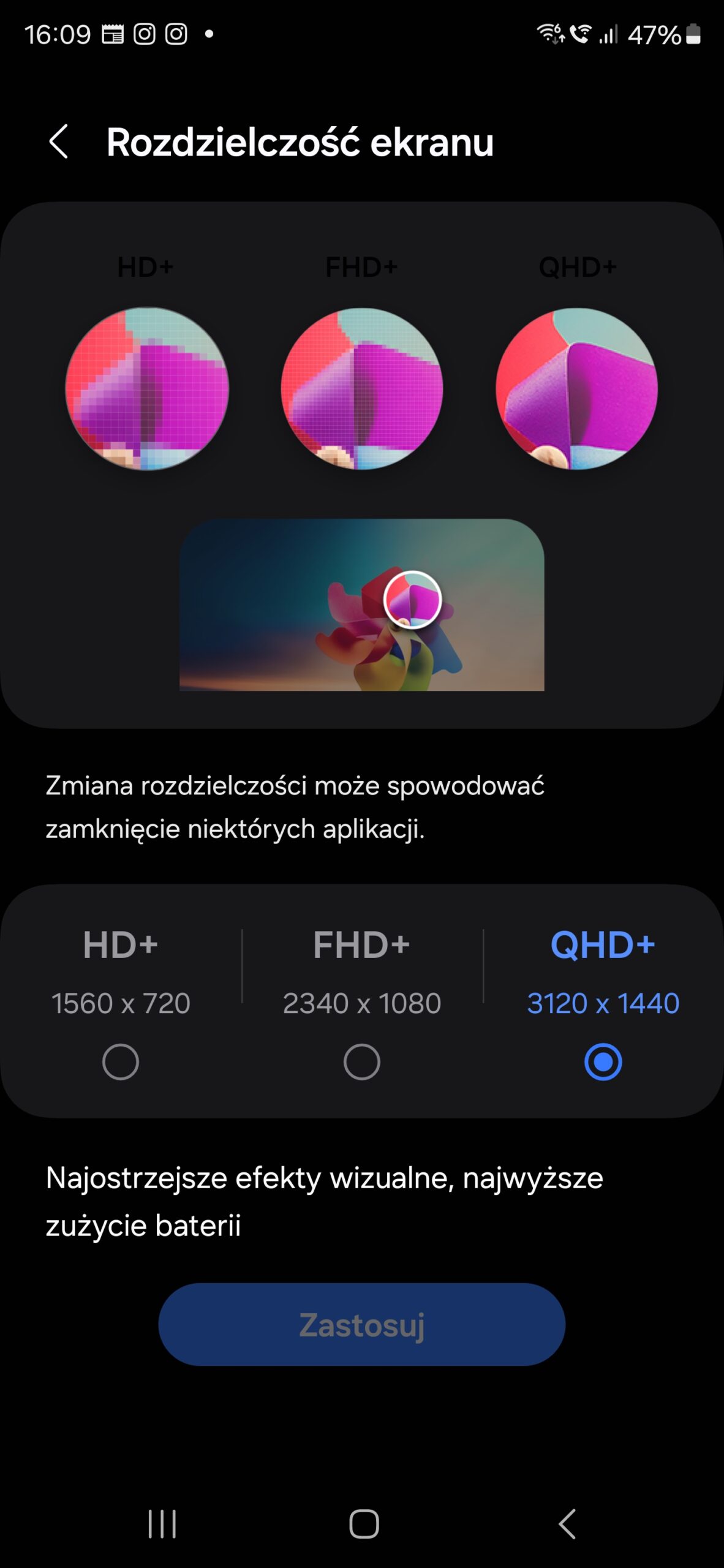 Samsung Galaxy S24 Ultra otrzymał wyświetlacz o przekątnej 6,8″, wykonany w technologii Dynamic LTPO AMOLED 2X. Rozdzielczość obrazu wynosi 1440 x 3120 (QHD+), przy czym ekran może pracować także w niższych rozdzielczościach, mniej zużywających energię. Odświeżanie adaptacyjne pozwala na sterowanie częstotliwością od 1 do 120 Hz, a standardowe, o czym warto pamiętać, nie ustawia na sztywno 60 Hz, tylko zmienia częstotliwość w zakresie 1-60 Hz. Większych różnic w zużyciu energii nie odnotowałem, zatem nie widzę większego sensu w stosowaniu trybu standardowego.