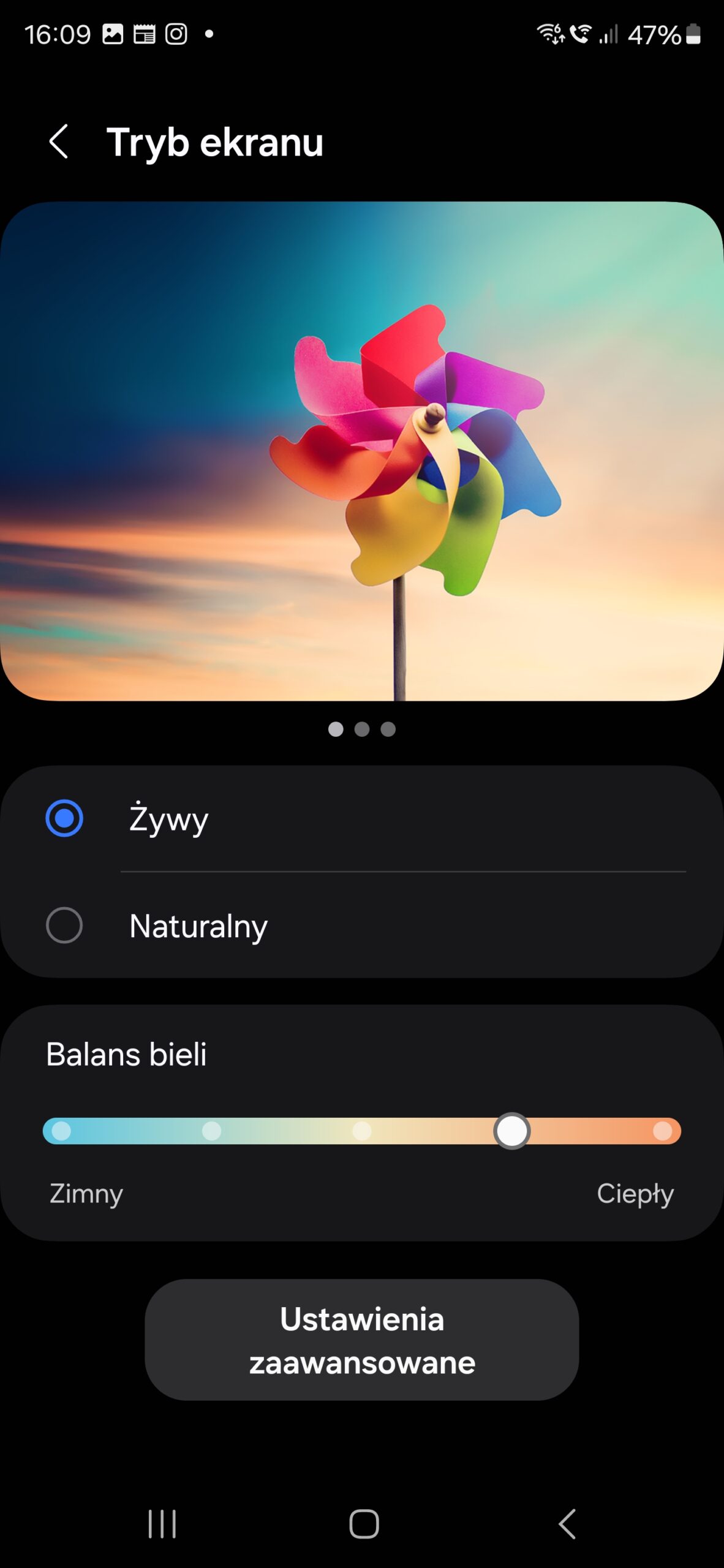 Odwzorowanie kolorów jest bardzo dobre. Typowo dla Samsunga, mamy do dyspozycji tryb ekranu naturalny i żywy, które zestrojone są tak, by odwzorowywać przestrzeń barwną odpowiednio sRGB i DCI-P3, przy czym dla ustawienia „żywy” najlepszy efekt osiągnąłem po ociepleniu bieli o jedną działkę.