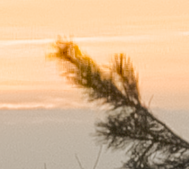 W zbliżeniu niestety widać znaczną ilość artefaktów wynikających ze składania wielu ekspozycji, już po lekkim wyciągnięciu cieni widać w ciemnych partiach trudny do usunięcia kolorowy szum. Na kontrastowych krawędziach widoczne jest halo, będące efektem albo kolejnych błędów składania ekspozycji, albo zbyt agresywnego użycia maski wyostrzającej, podbijającej lokalny kontrast.