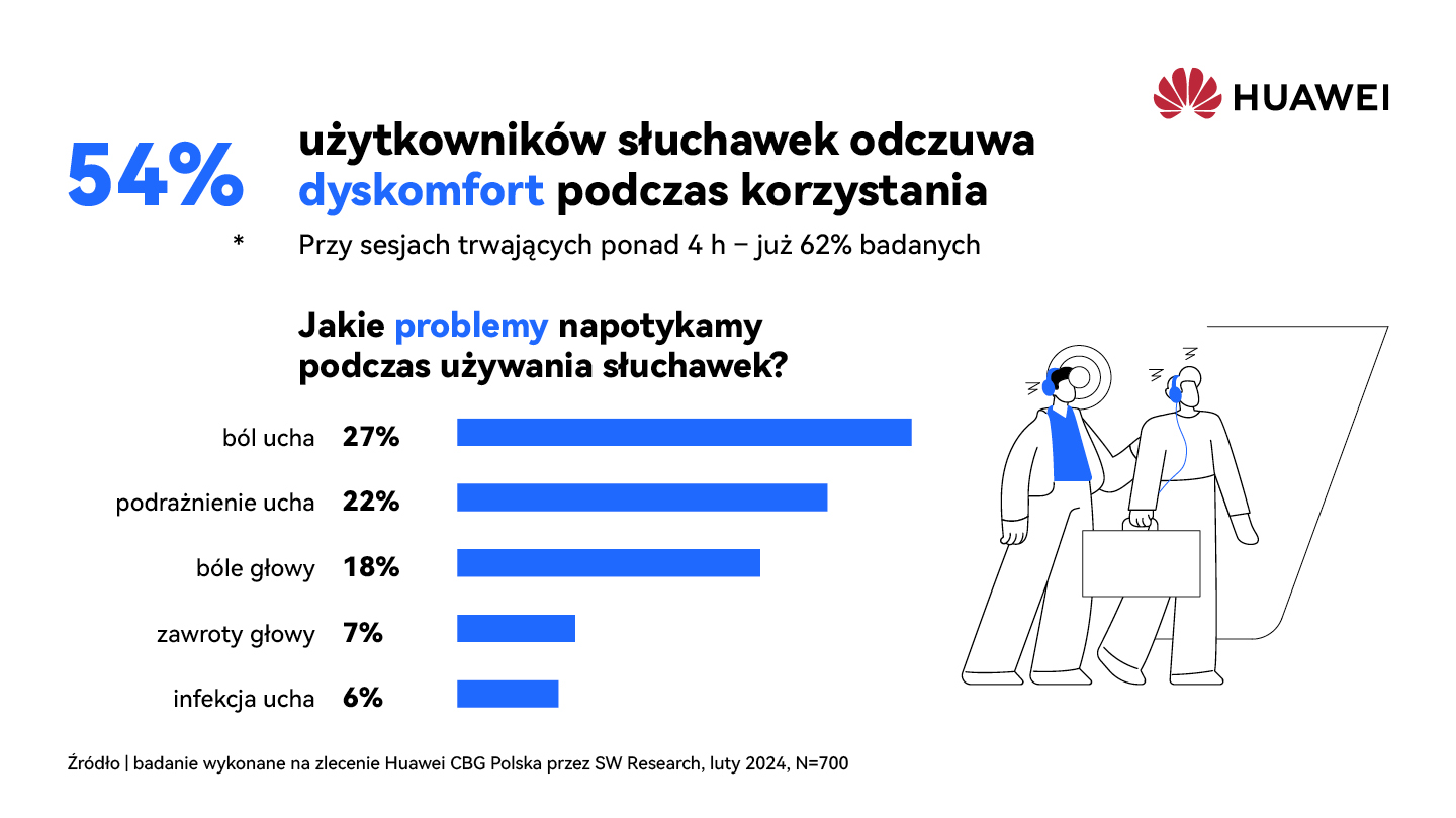 Słuchawki stały się już dobrem podstawowym, a za potwierdzenie tej tezy niech posłuży wynik z badania przeprowadzonego na zlecenie Huawei CBG Polska, według którego aż 76% osób dorosłych w Polsce przyznaje się do posiadania choć jednego takiego produktu. Tym bardziej smuci, że aż 54% użytkowników słuchawek odczuwa różne niedogodności podczas ich używania. Odsetek narzekających zwiększa się wraz z długością sesji spędzonych ze słuchawkami na uszach. Powyżej czterech godzin słuchania problemy zgłasza już 62% badanych w Polsce. A co nam w zasadzie najczęściej w nich dokucza?
