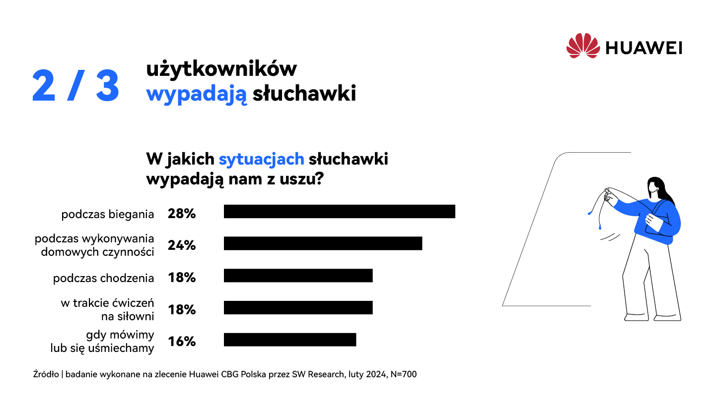 Co ciekawe, najczęściej w kontekście używania słuchawek… boli nas ucho (27% ankietowanych). Na drugim miejscu plasuje się podrażnienie ucha (22%), zaś podium zamyka ból głowy (18%). Do tego u niektórych dochodzą jeszcze zawroty głowy (7%), a nawet infekcja ucha (6%). Dyskomfort spowodowany noszeniem słuchawek to jedno, ale istotny problem stanowi również samo wypadanie słuchawek z uszu – doświadcza tego 2 na 3 użytkowników. Najczęściej słuchawki wypadają samoczynnie z uszu podczas biegania (28% respondentów), wykonywania prac domowych (24%), a także na siłowni i podczas zwykłego przemieszczania się (18%).
