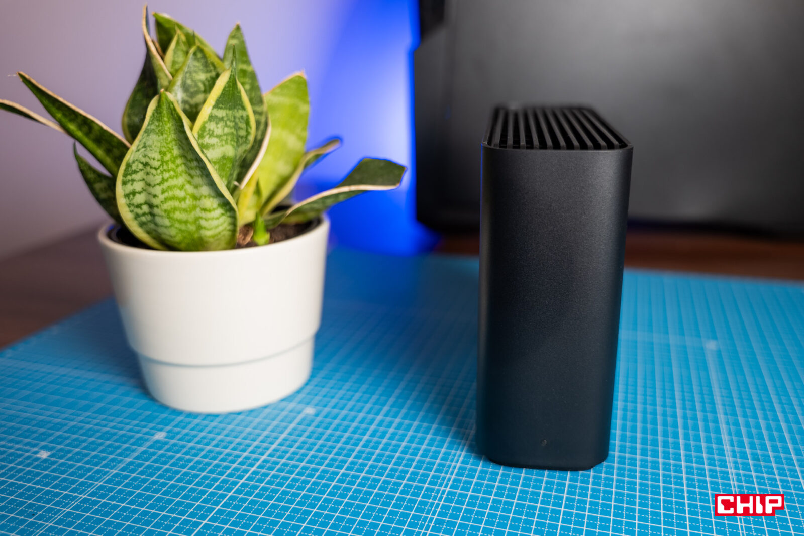 Synology BeeStation (w naszym przypadku w wariancie z 3,5-calowym dyskiem 4 TB) to niewielkie rozwiązanie, które postawiono w okolicy routera nie powinno nadmiernie rzucać się w oczy. Minimalistyczna, zaoblona, czarna obudowa przypomina kompaktowe routery albo część systemu mesh i z pewnością da się ją wkomponować w wiele aranżacji, jeśli to dla was istotne.