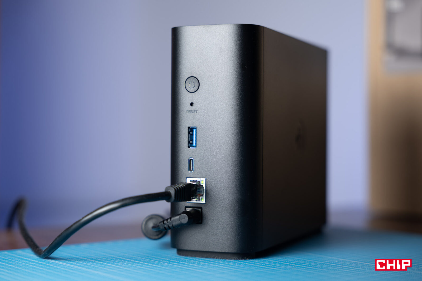 Konfiguracja okazała się prosta i bezproblemowa, podobnie jak sam sprzęt. To nie nagrywarka z dyskiem, którego pracę usłyszelibyśmy w całym pomieszczeniu. Synology BeeStation pracuje cicho i nie zwraca na siebie szczególnej uwagi. Jeśli mamy ze sprzętem jakikolwiek problem, poza wyłącznikiem znajdziemy też ukryty w obudowie przycisk resetowania. Do zarządzania plikami zaprzęgnięto chipset Realtek RTD1619B z czterema rdzeniami Cortex-A55 i 1 GB pamięci operacyjnej. Nie zabrakło też portów USB – jednego portu USB-A 3.2 Gen 1 i jednego USB-C 3.2 Gen 1. Po co? O tym nieco później.