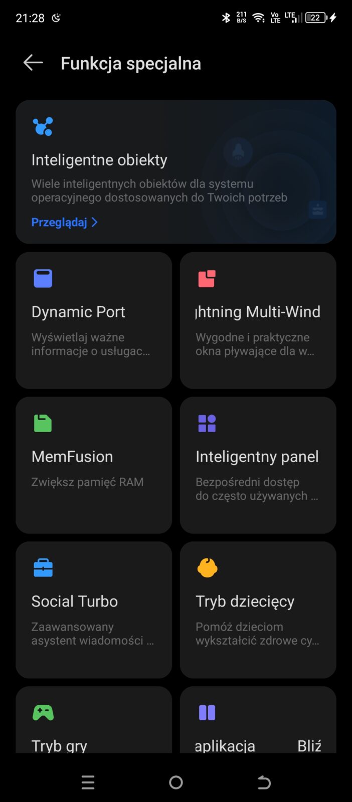 - funkcje specjalne, czyli inteligentne – tu znajdziemy między innymi asystenta powiadomień z sieci społecznościowych, narzędzia pozwalające na upiększane na klipach wideo, zmieniacz głosu, pływające okna (aktywowane gestem) oraz ochronę przed podglądaniem.