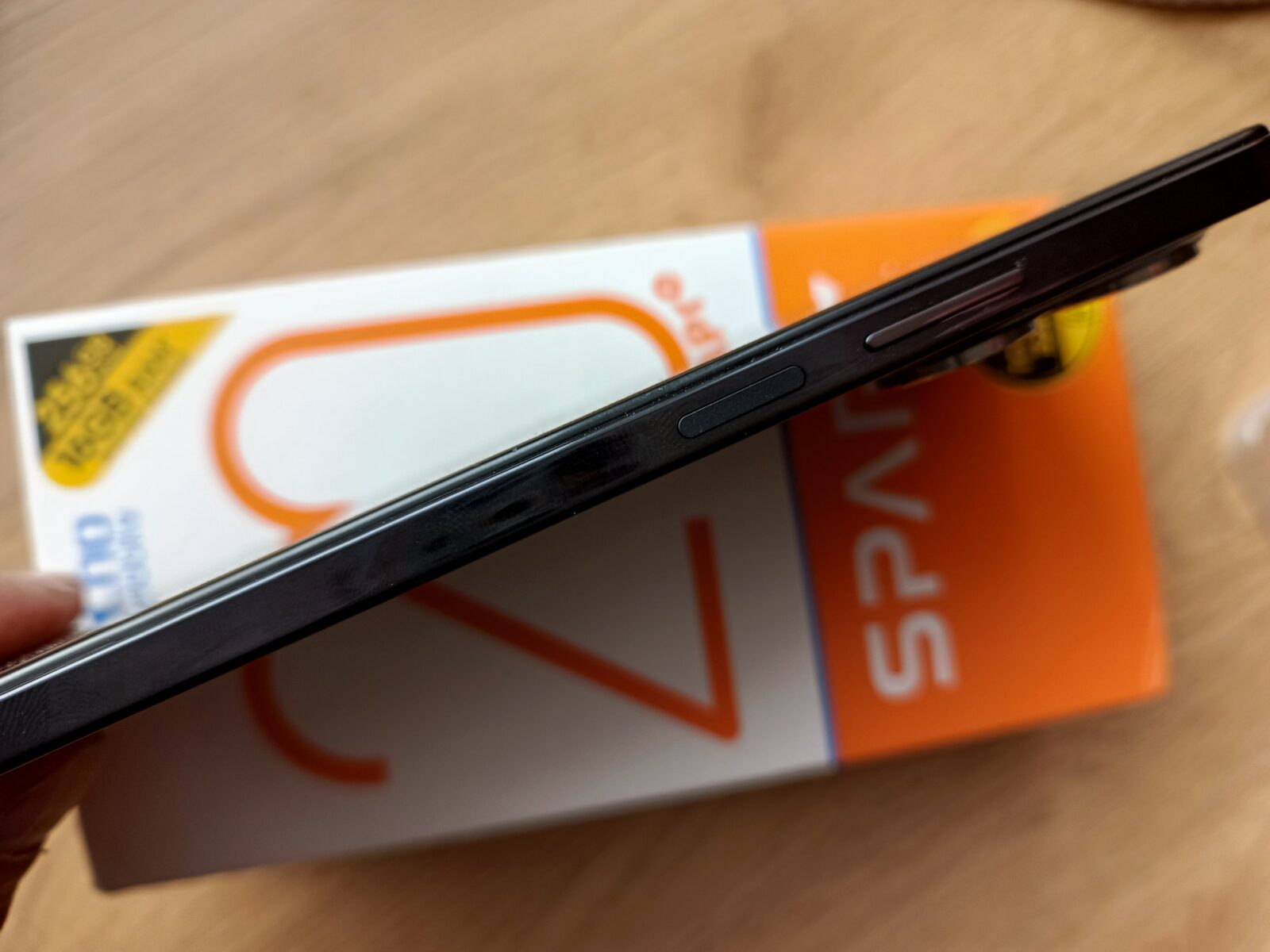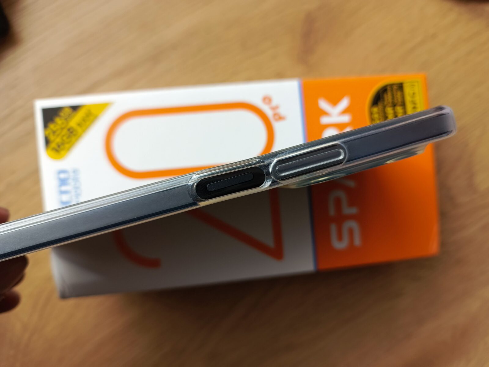 Model Tecno Spark 20 Pro to wyświetlacz 6,78″, z aparatem przednim umieszczonym klasycznie, na środku ekranu u góry. Z prawej strony znajduje się przycisk zasilania oraz przycisk regulacji głośności. Gdy założymy plecki, ten drugi znajduje się pod materiałem, co zapobiega przypadkowym naciśnięciom np. podczas przenoszenia smartfona w kieszeni. Wejście USB-C i jack umieszczono na dole, tacka na karty SIM znajduje się w klasycznym miejscu, czyli po lewej stronie na górze.
