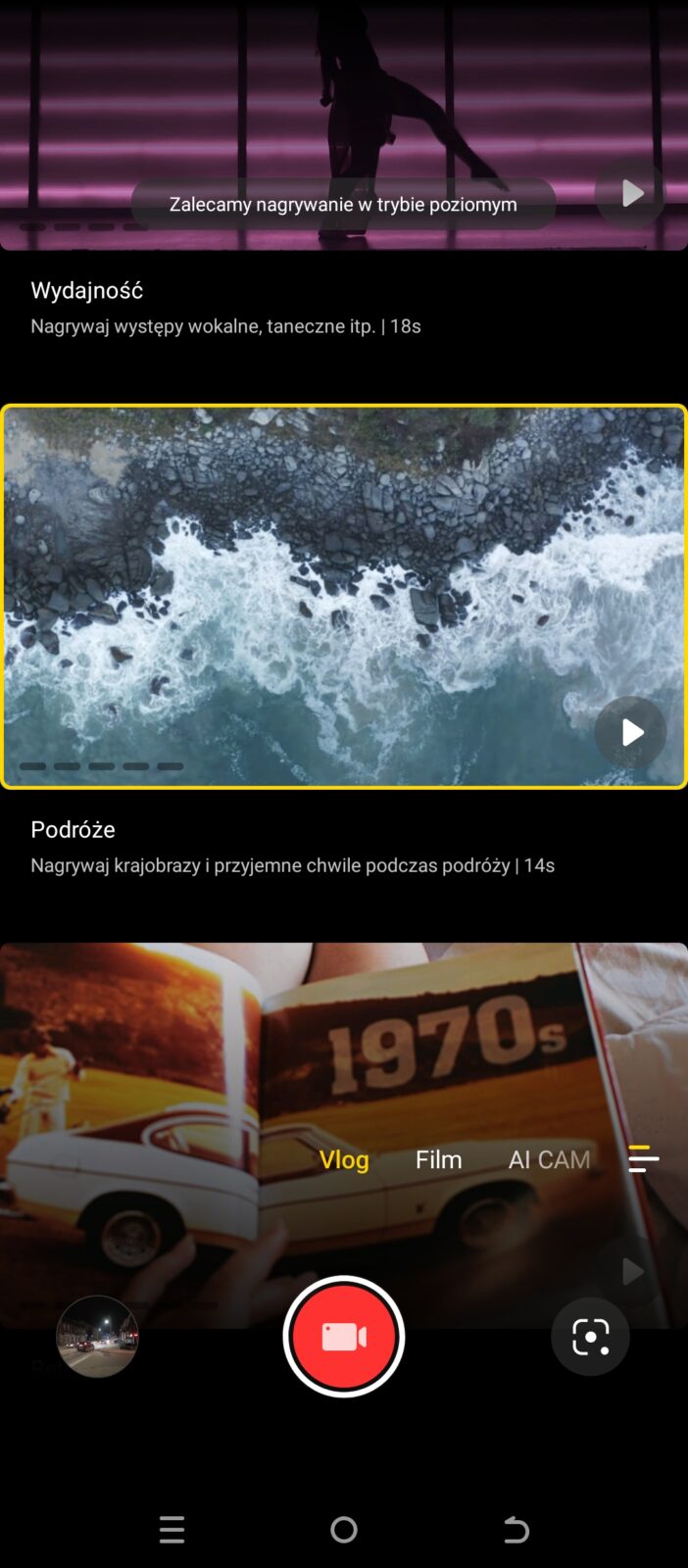 Jeśli chodzi o klipy wideo, nagrywane są w rozdzielczości 2K. Można wybrać dwa rodzaje nagrań – Vlog oraz Film. W tym pierwszym przygotowano już odpowiednie tryby, jak impreza, podróże, retro, rodzina czy ulica. Przy Filmach można z kolei korzystać z “upiększeń SI”, które pozwolą na poprawienie koloru skóry, wysmuklenie twarzy czy wycinanie niepasujących elementów. W oby rodzajach zapisu wideo możesz liczyć na różne optymalizacje, jak redukcja szumów. I tu również nie mam zastrzeżeń.