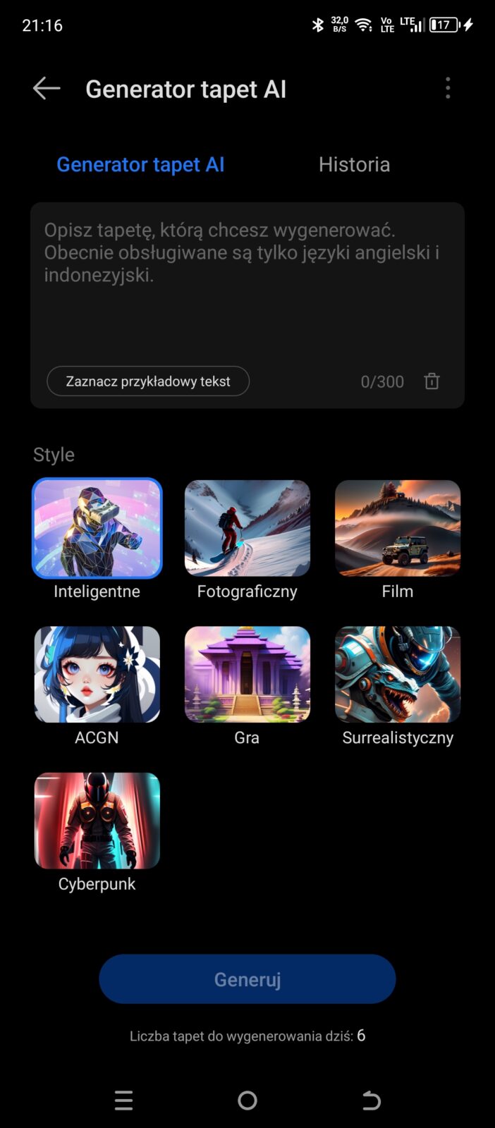 - Generator tapet AI – wpisując prompty w języku angielskim możesz utworzyć dowolną tapetę w jednym z siedmiu stylów. Przypomina to choćby Midjourney czy Kreator Obrazów Bing. Można tworzyć do sześciu tapet SI dziennie;