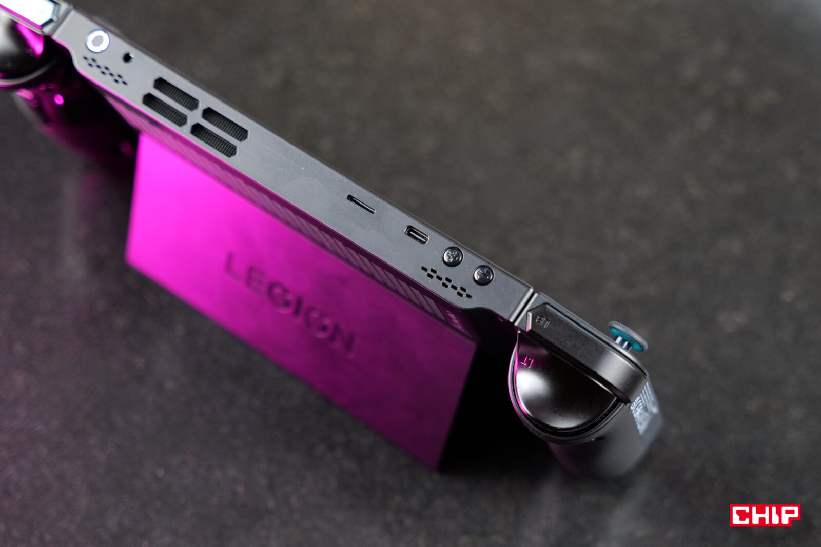 Najważniejsze rzeczy w Lenovo Legion Go dzieją się na górnej ramce. To tam ulokowano zarówno gniazdo słuchawkowe, jak i slot na kartę Micro SD, a także przyciski do regulowania głośności i włącznik z diodą LED. Znajdziemy tam także port USB-C, ale co ciekawe, Lenovo umieściło drugi, taki sam port w dolnej części. Obydwa obsługują transfer plików i ładowanie z mocą do 65W. Wracając jednak na górną krawędź – przyciski zmiany głośności działają dobrze i klikają przyjemnie, podobnie jak wyłącznik. Jedyne, na co mogę narzekać, to slot na kartę Micro SD, który nie został obudowany w żaden sposób i należy wkładać do niego kartę dość ostrożnie.