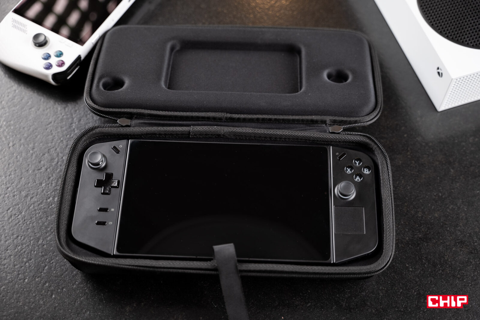 Do testów dotarł zestaw z futerałem obitym wewnątrz miękkim materiałem, pod którym kryje się dopasowana do wymiarów konsoli pianka lub karton. Do tego przyszyto pasek, który, jak mniemam, powinienem przełożyć przez front konsoli i ukryć jego końcówkę za nią. W centrum tego zestawu gości podstawka do jednego z kontrolerów, która pomoże zamienić go w fuzję myszki i arcade sticka (ale o tym później).