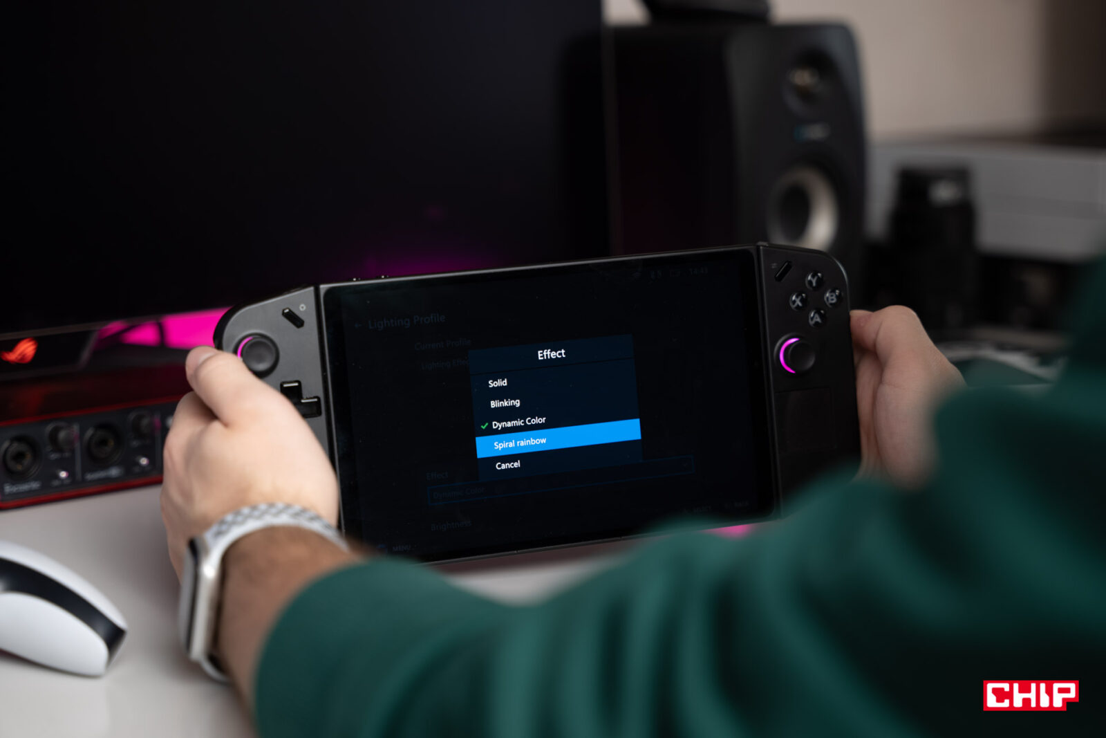 Jest jednak sporo rzeczy do skonfigurowania. Część z nich umieszczono w skrótach dostępnych po naciśnięciu górnego przycisku na froncie prawego kontrolera. W ten sposób szybciej przełączymy rozdzielczość renderowanego obrazu, zmienimy jasność czy zmienimy ustawienia wibracji. Przełączymy się też między jednym z trzech efektów świetlnych, które możemy możemy modyfikować w ustawieniach, w tym zmieniać ich jasność i tempo przechodzenia. Ustawimy też pobór mocy w danym trybie, jak i moc pracy wiatraków. Maksymalne TDP wynosi tu 30W.