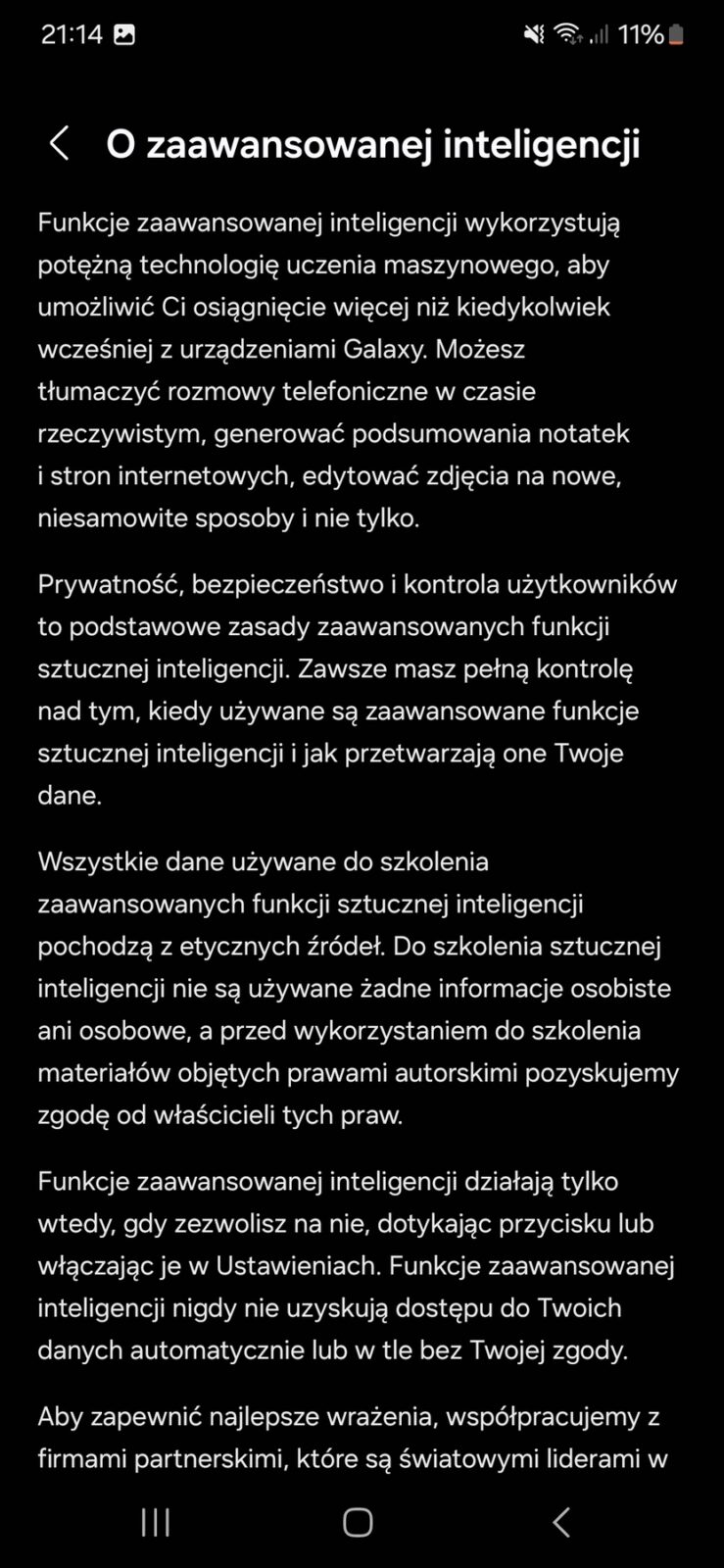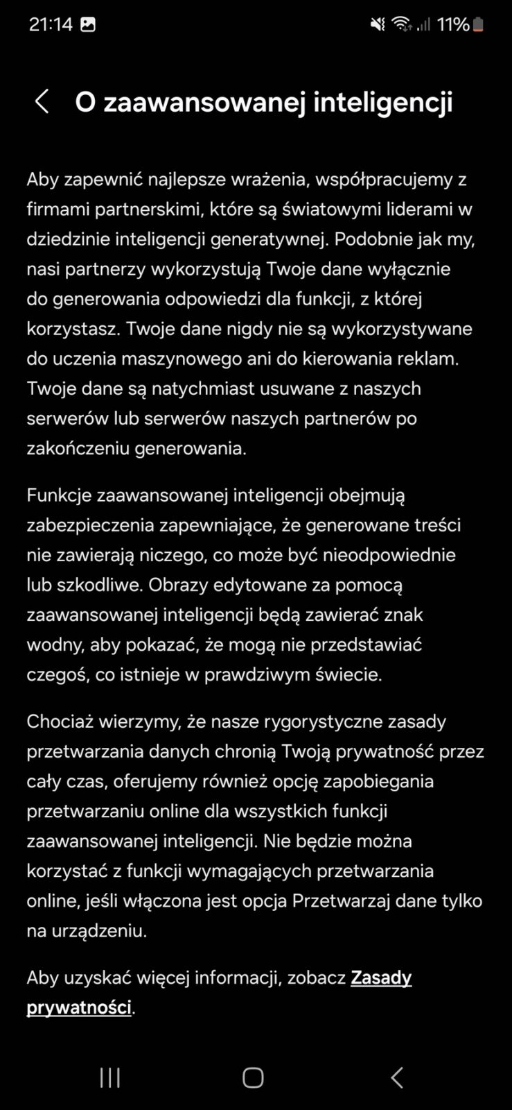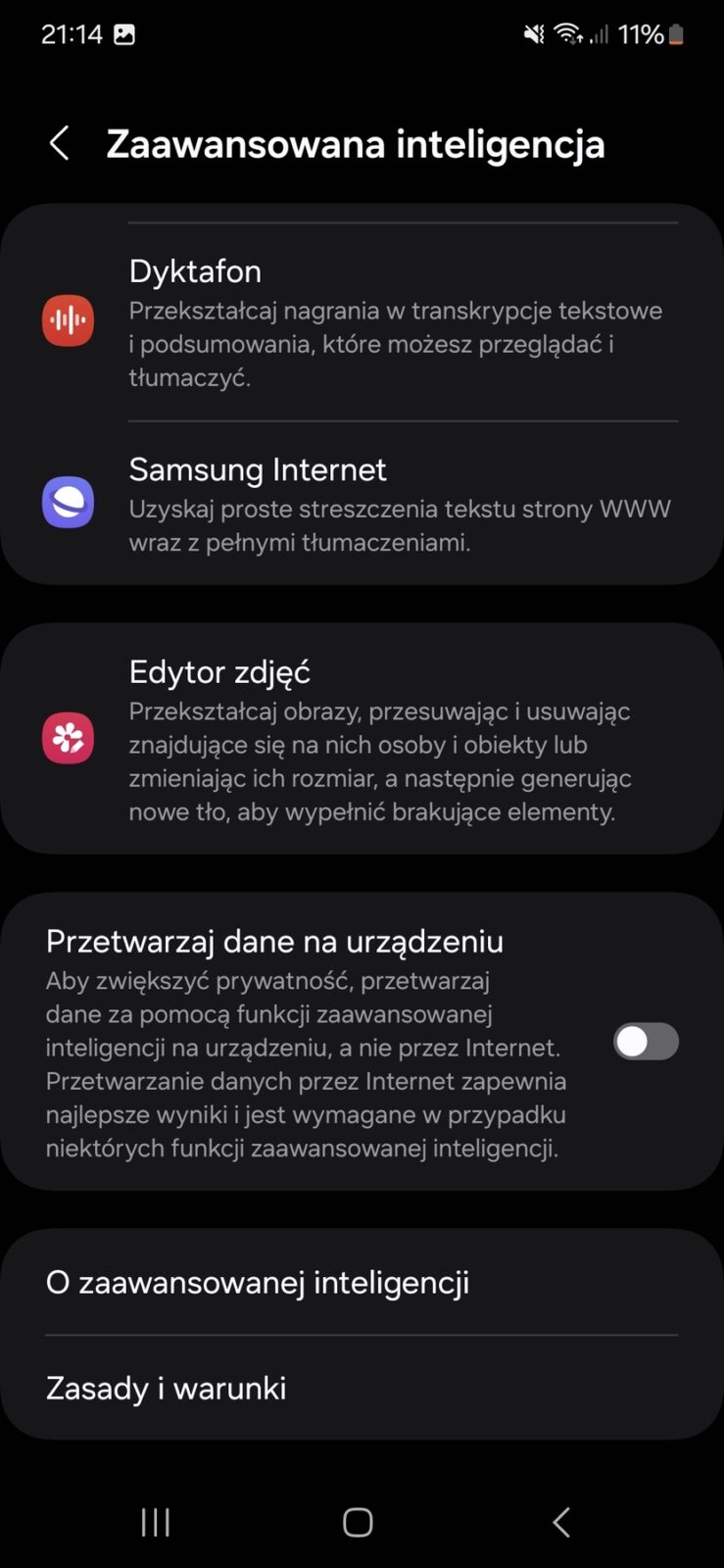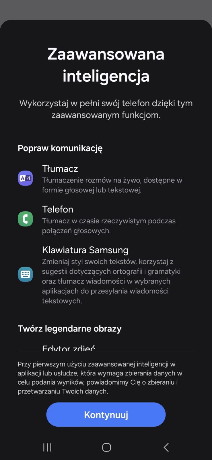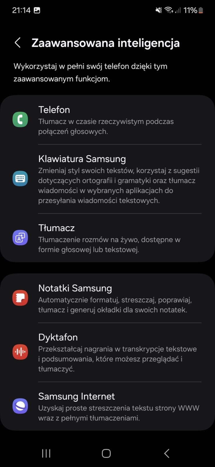 Wracając jednak do samej Galaxy AI to jest tak naprawdę zestaw funkcji, które producent nazwał w menu „zaawansowaną inteligencją”. Dla zachowania przejrzystości, opiszę je na początek punkt po punkcie, tak, jak widnieją one w menu ustawień: