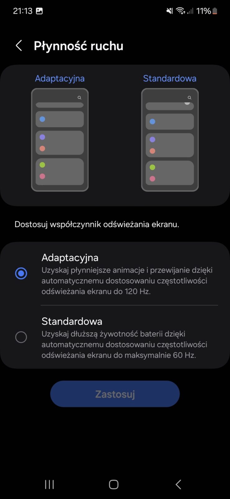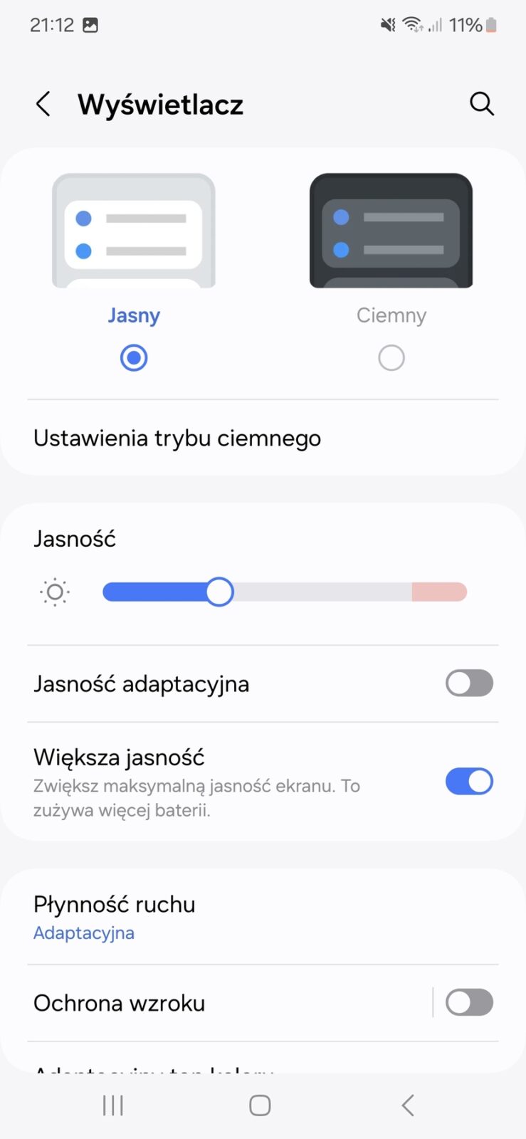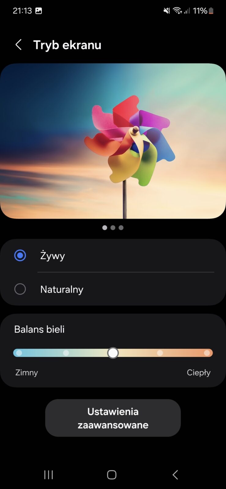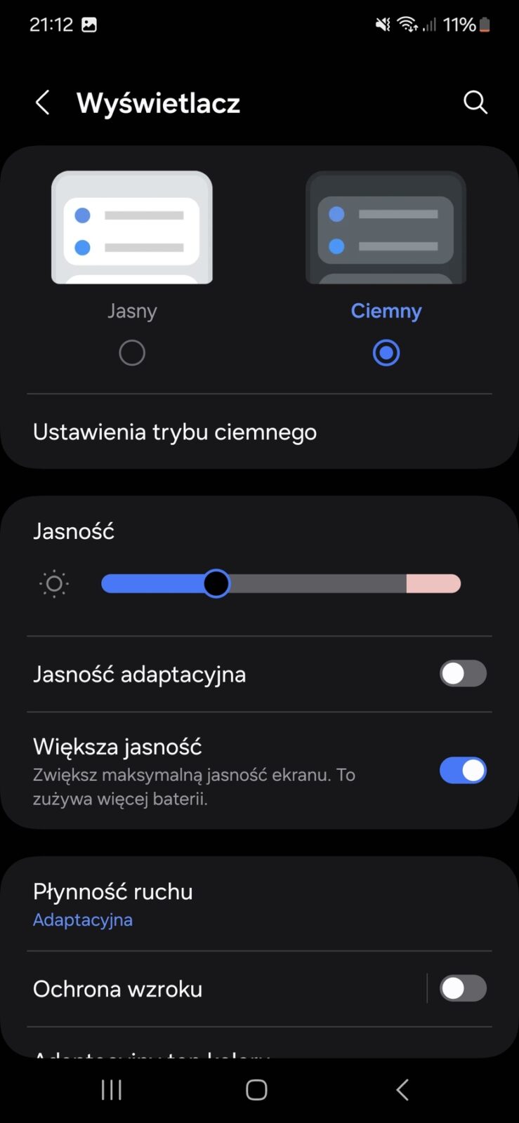 W ustawieniach możemy włączyć tryb ciemny dla menu, dostosować częstotliwość odświeżania oraz rozdzielczość ekranu oraz wyregulować barwy i balans bieli. Jest też opcja zwiększenia czułości dotyku. Co ciekawe, telefon domyślnie ma ustawioną rozdzielczość nie 3120 x 1440, a 2340 x 1080 pikseli. Zapewne wynika to z chęci optymalizacji czasu pracy na jednym ładowaniu. Nie możemy ustawić częstotliwości odświeżania „sztywno” na 120 Hz. Możemy tylko wybrać tryb adaptacyjny, który sam steruje częstotliwością w zakresie od 1 do 120 Hz, w zależności od potrzeb.