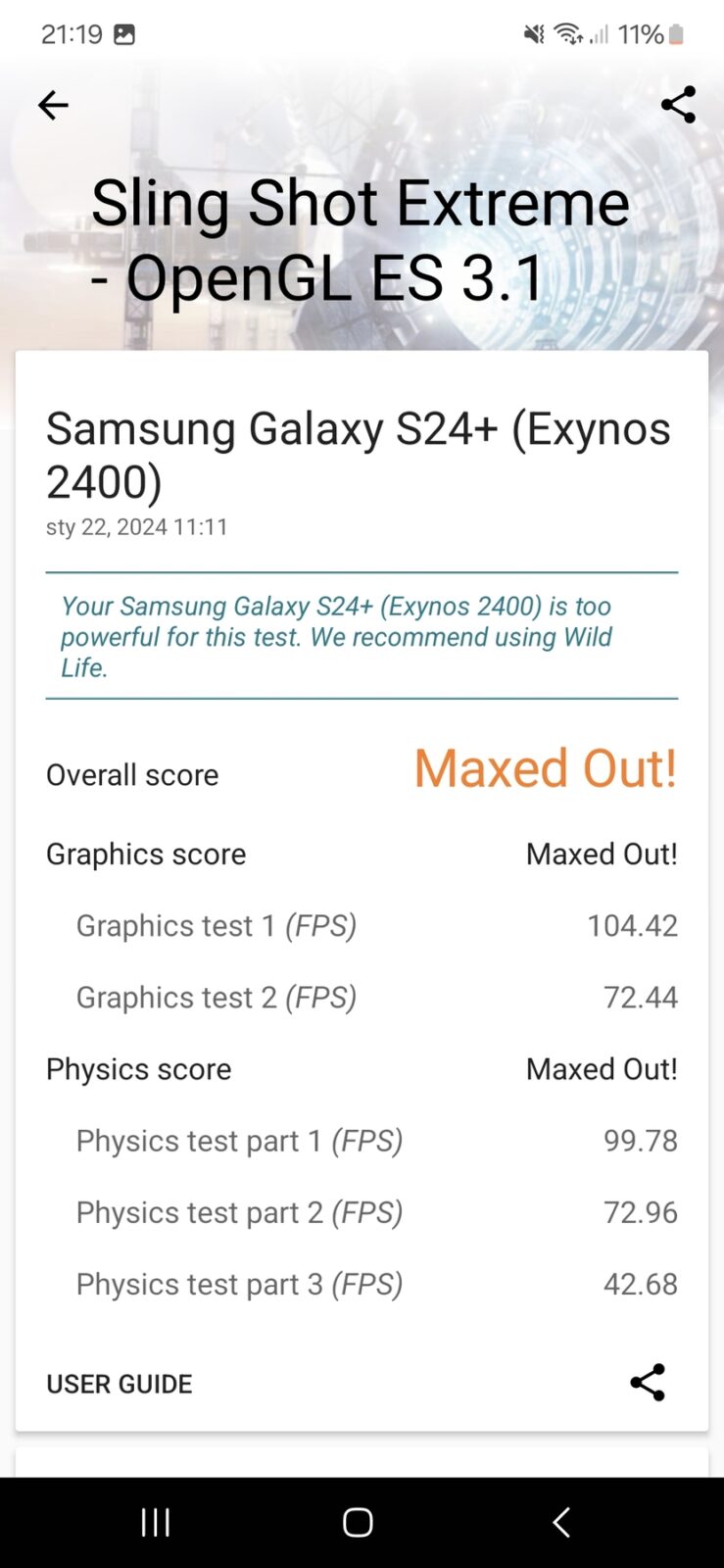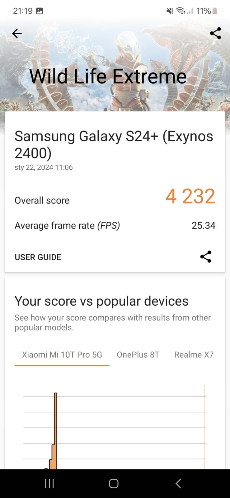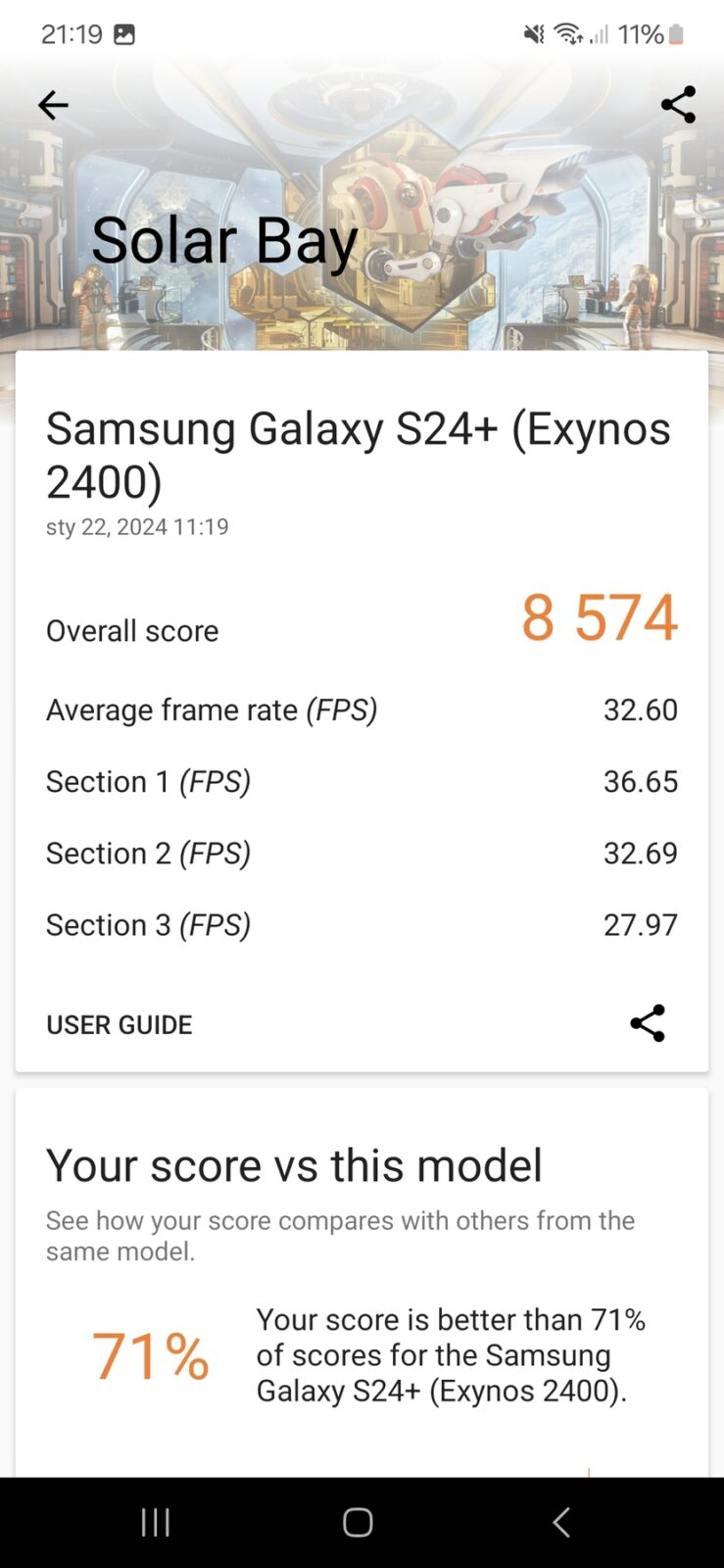 Wracając jednak do tematu – Samsung Galaxy S24+ został wyposażony w Exynosa 2400, a partneruje mu układ graficzny Eclipse 940 i 12 GB pamięci RAM. Zacznijmy od dobrych wiadomości – wydajność stoi na topowym poziomie, wystarczy spojrzeć na wyniki benchmarków: