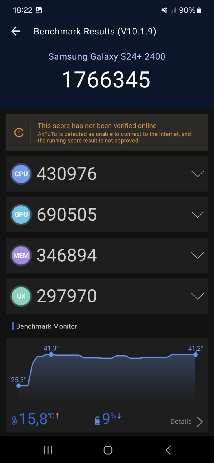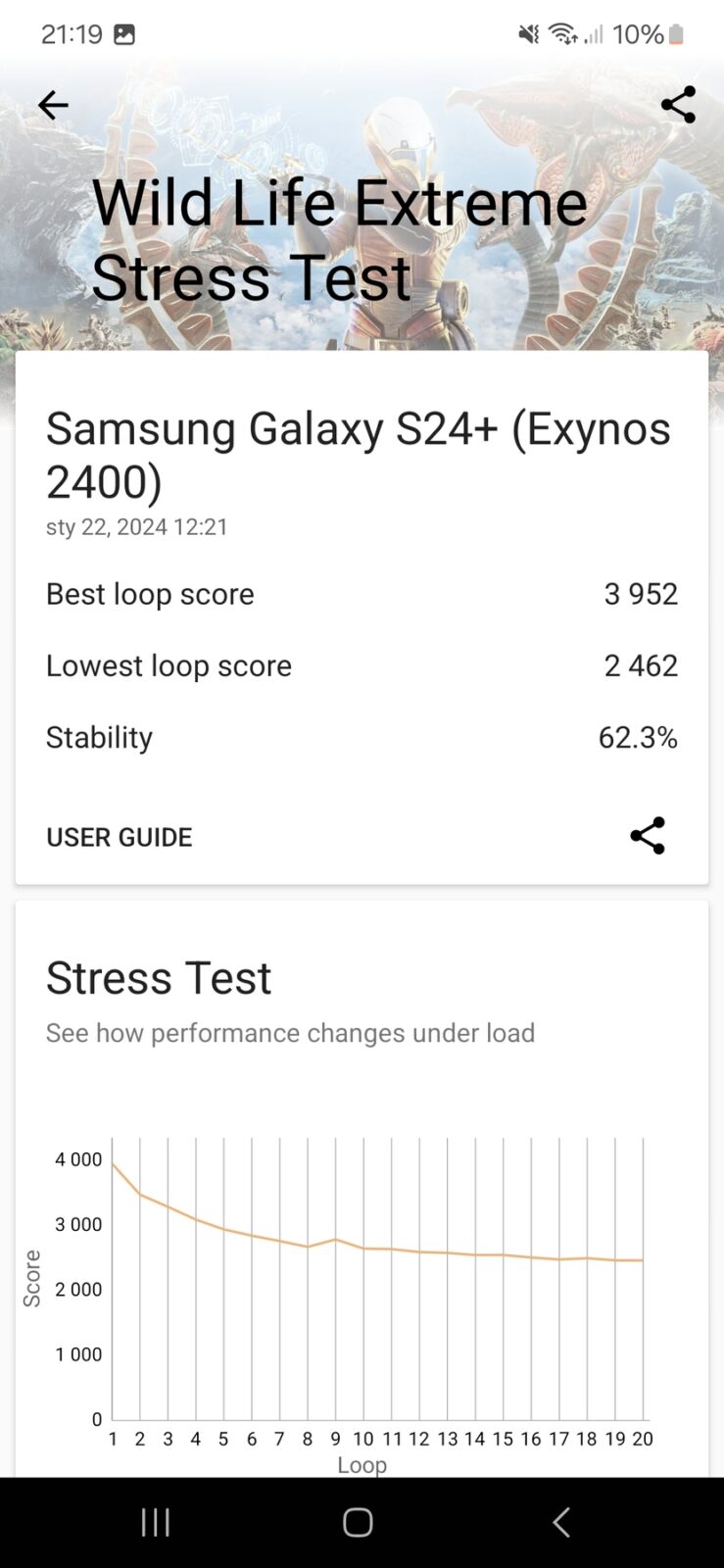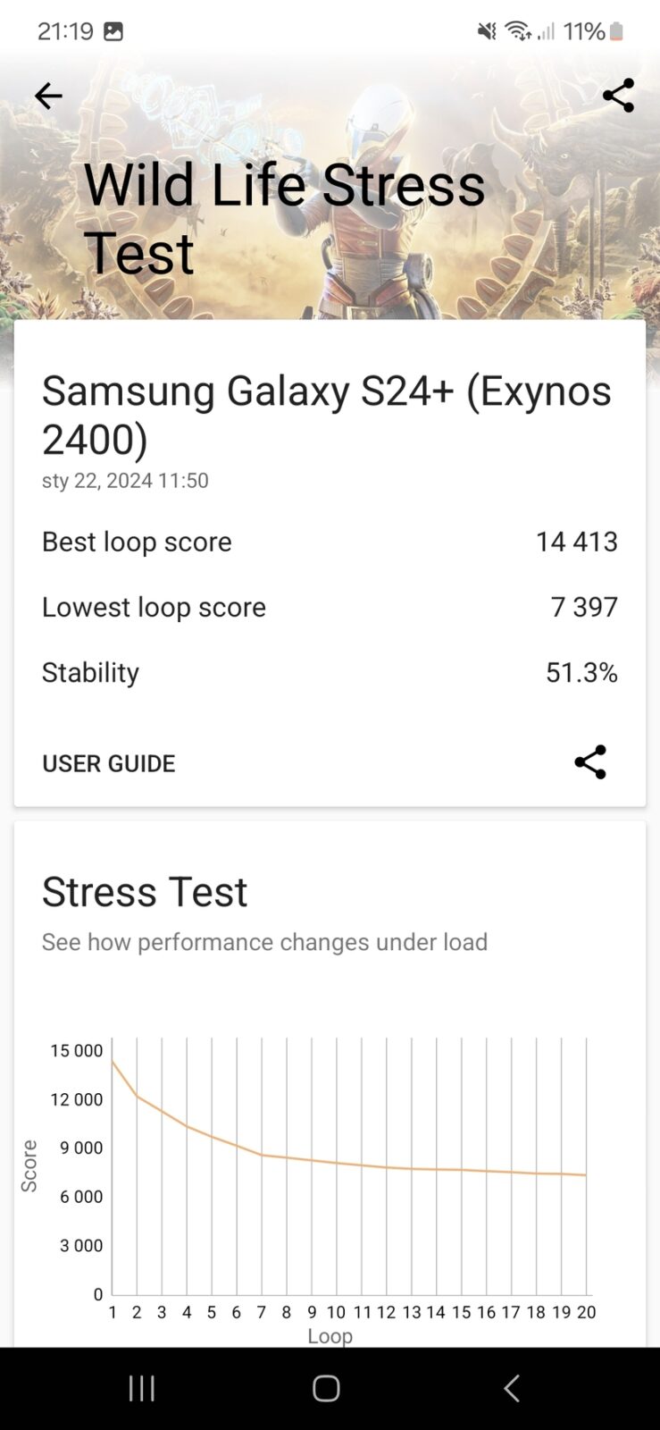 Tyle z plusów, teraz minusy. Po pierwsze – Samsung Galaxy S24+ mocno się nagrzewa podczas naprawdę intensywnej pracy. Jak bardzo? Maksymalna temperatura obudowy jaką zmierzyłem, to 47 stopni w okolicy aparatu głównego. Jest to naprawdę mocno wyczuwalne podczas trzymania urządzenia. Po drugie – powoduje to znaczący spadek wydajności i to już po kilkunastu minutach. Jak duży? Stress testy pokazują, że spadek wynosi między 35 a 50%, czyli sporo.