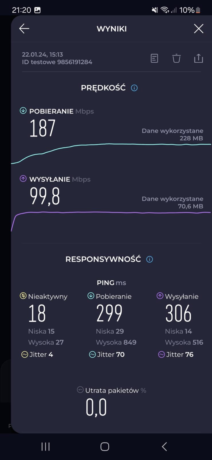 W temacie wyposażenia oczywiście jest „na bogato”, ale nie mogło być inaczej. Telefonobsługuje sieci 5G i w programie Speedtest (w centrum Warszawy w sieci Orange) uzyskałem maksymalnie 187 Mb/s (pobieranie) i 99,8 Mb/s (wysyłanie danych). Tragedii nie ma. Oczywiście możemy skorzystać również z Wi-Fi w standardzie 6E.