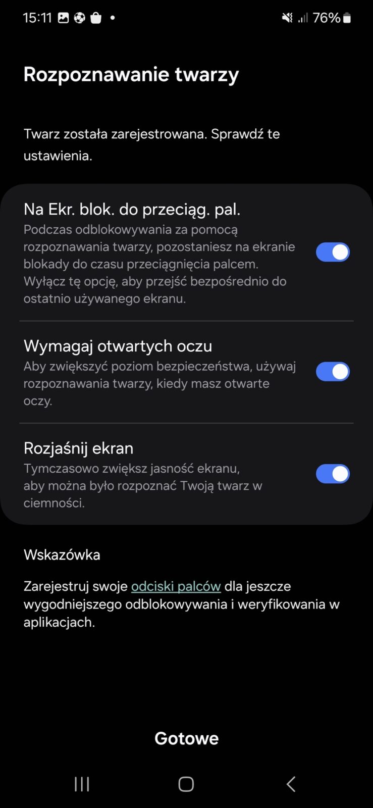 Jeśli chodzi o zabezpieczenia biometryczne, to czytnik linii papilarnych został umieszczony pod ekranem i działa bardzo szybko i celnie. Na szczęście jest również cały czas aktywny, więc z odblokowaniem nie ma problemu. Skaner twarzy również działa bardzo dobrze, także brawa. Ciekawą opcją jest „rozszerzone odblokowanie”, które utrzymuje urządzenie odblokowane, gdy ma się je przy sobie lub w określonych zaufanych miejscach lub w pobliżu zaufanych urządzeń. Jak to działa? Całkiem nieźle, ale czy to bezpieczne rozwiązanie? Tu mam wątpliwości, w końcu w zaufanym miejscu również ktoś nam może przeglądać zawartość telefonu, gdy np. go zostawimy na szafce.