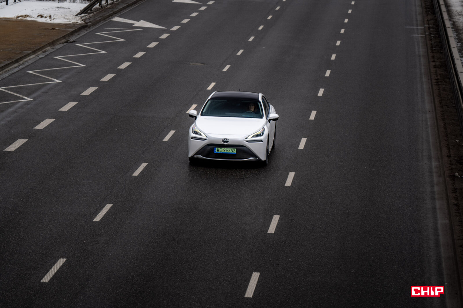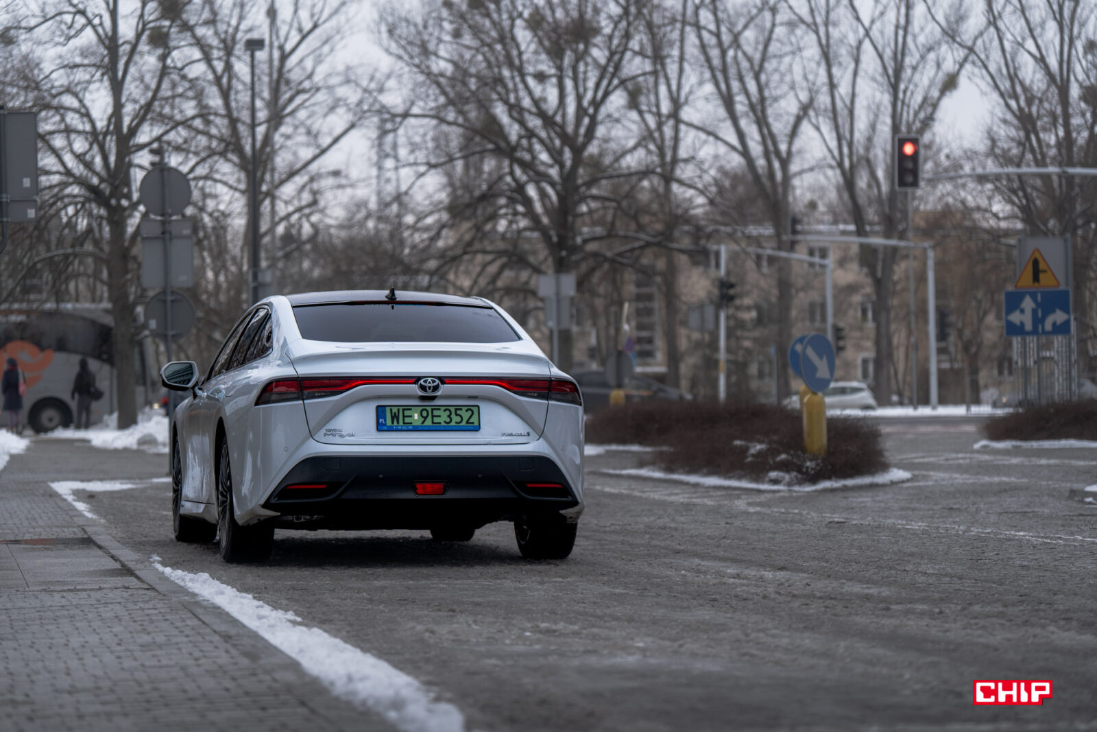 Mirai zbudowano na platformie GA-L, która pozwoliła na rozmieszczenie poszczególnych elementów napędu tak, aby rozłożyć masę między przodem i tyłem w proporcji 50:50, do tego dołożono niski środek ciężkości i znacznie sztywniejsze nadwozie, co w efekcie dało nam auto cholernie stabilne i nie są to jedynie obiecanki producenta. Kiedy sprawdzaliśmy Mirai na autostradzie, wiało i padało, ale auto niewiele sobie z tego robiło i pozwalało na rozwijanie prędkości, na które nigdy nie pozwoliłabym sobie w większości testowanych przez nas aut. Jedyny moment grozy jaki przeżyłam to bliskie spotkanie z bliżej nieokreślonym ptakiem drapieżnym, który najwyraźniej uznał, że strome podejście do lądowania prosto na pędzące auto to iście wyborny pomysł i gdyby nie wentylowane tarczowe hamulce zainstalowane we wszystkich czterech kołach, musiałabym się gęsto tłumaczyć Toyocie, a na pocieszenie miałabym na obiad nieco… zdeformowane udka z pieczonego kurczaka drapieżnego. Muszę przyznać, że nie wiem, czy myśląc racjonalnie, wcisnęłabym pedał hamulca prawie do podłogi przy prędkości 140 km/h na zalanej deszczem autostradzie, ale cóż, zadziałał instynkt. Ptak przeleciał sobie jakby nigdy nic, a Mirai nawet nie drgnął, o jakiejkolwiek utracie przyczepności nie było nawet mowy.