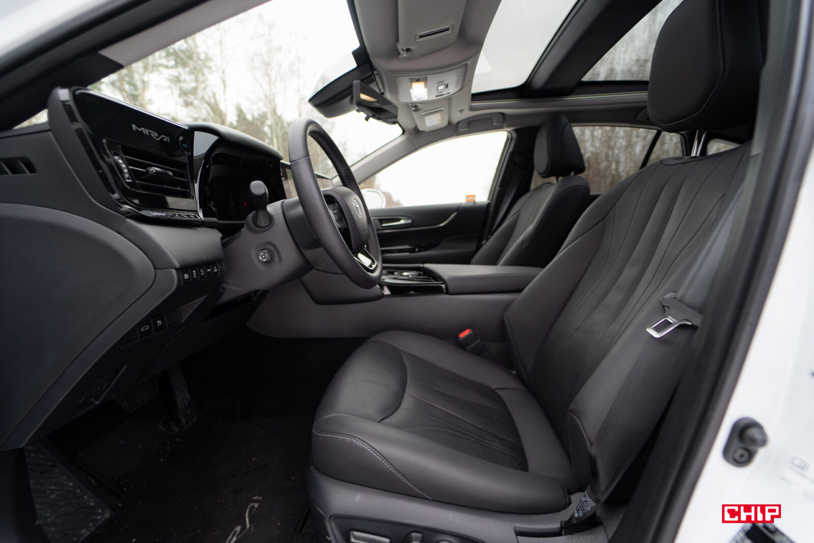 Z zewnątrz Toyota Mirai wydaje się stosunkowo wąskim autem, czego kompletnie nie odczujemy w środku. Wnętrze wydaje się bardzo szerokie i jest to o tyle ciekawe, że zostało dosyć mocno zabudowane. Szeroki tunel środkowy, dosyć mocno rozbudowana deska rozdzielcza, a pomimo to nie jest to wnętrze klaustrofobiczne, choć pod względem przestrzeni nieidealne.