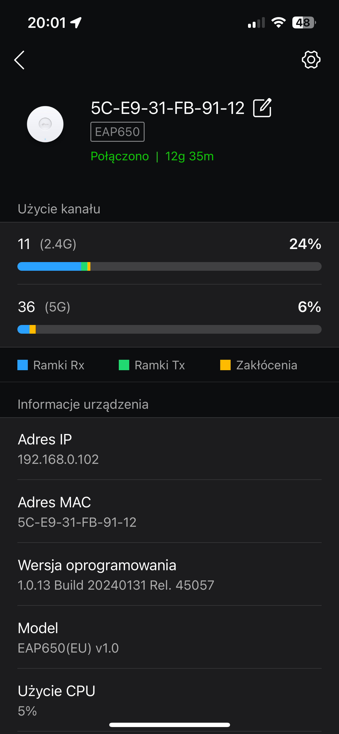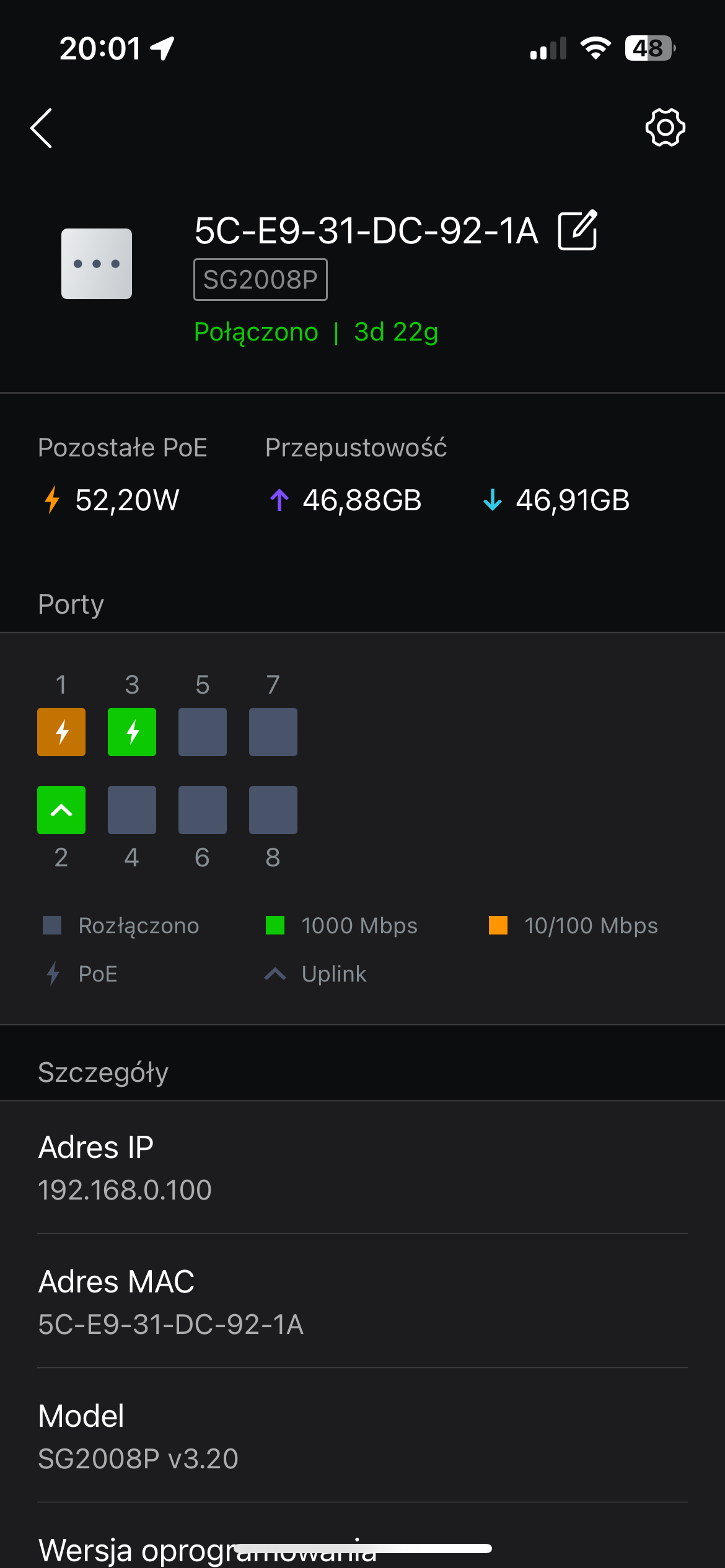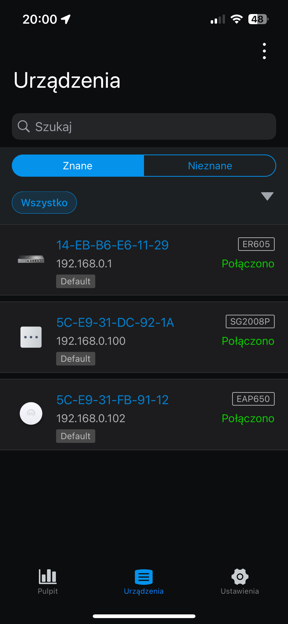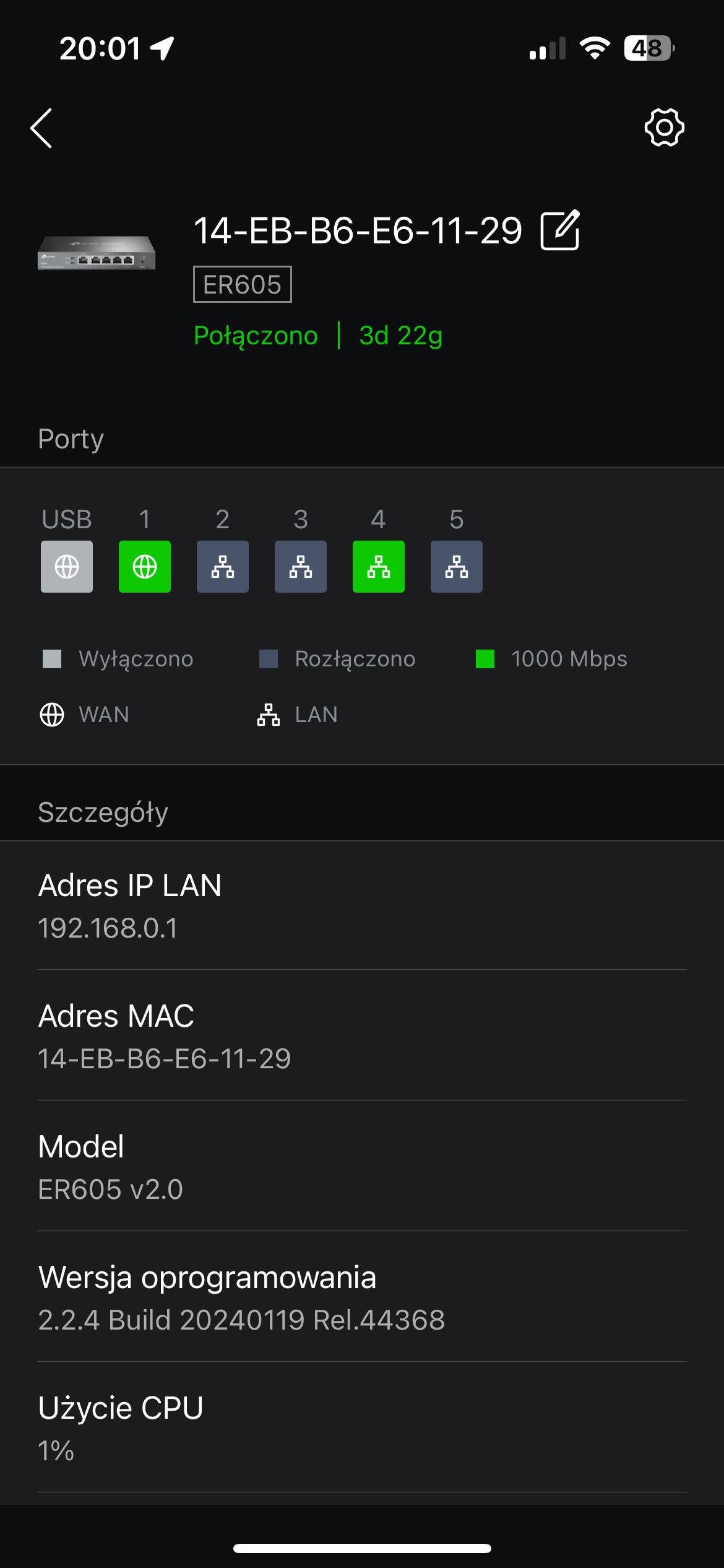 Dalej było jednak trochę gorzej. Centralne zarządzanie siecią wymaga podpięcia kontrolera OC200 pod konto TP-Link, które mam od dawna. Problem w tym, że mimo resetowania do ustawień domyślnych kontroler za nic nie pozwalał się skonfigurować. Pomogło… wejście w konfigurację routera i ustawienie tam podstawowych parametrów – wtedy dało się podpiąć kontroler pod moje konto TP-Link i rozpocząć adopcję routera, switcha i AP. Wszystko szło przez chwilę bez problemu – po adopcji kontroler zgłosił dostępność aktualizacji firmware dla routera, AP i switcha, dałem zgodę, aktualizacje się pobrały, zainstalowały i… kontroler ponownie całkowicie stracił kontakt siecią. Po godzinie oczekiwania aż się połączy z serwerami TP-Linka straciłem cierpliwość, przywróciłem router do ustawień fabrycznych, wszedłem w konfigurację lokalną i… tak, kontroler nagle odzyskał łączność, co pozwoliło na ponowną adopcję.