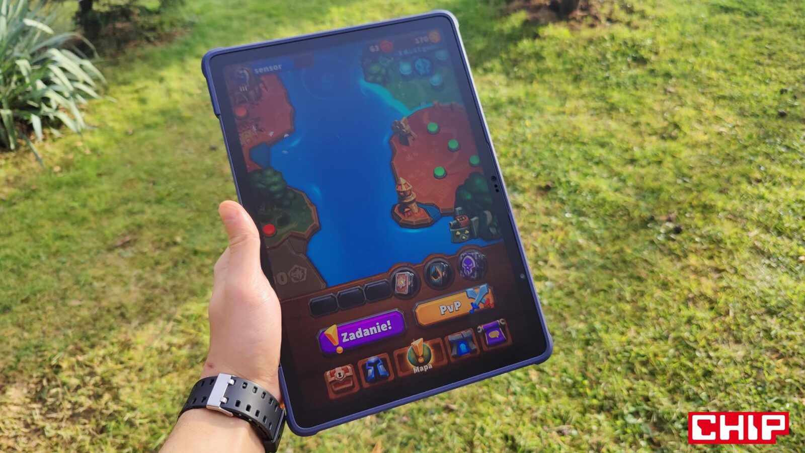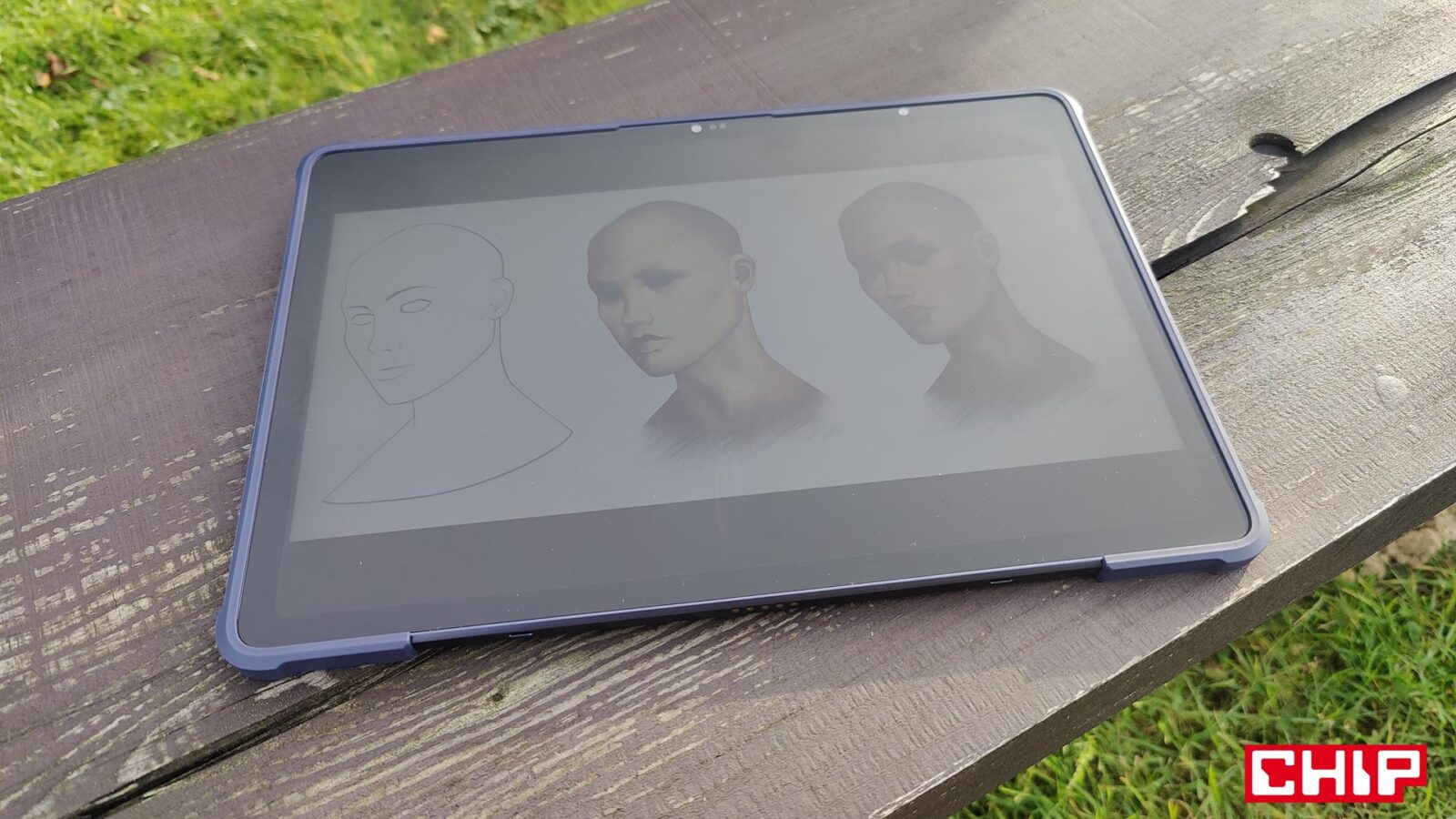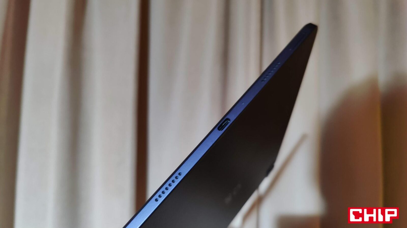 O ile krawędzie tabletu są raczej standardowo zaaranżowane (port USB-C do ładowania mocą do 18W, przycisk on/off na górnej krawędzi, dwuczęściowy przycisk regulacji głośności na pewnym boku), tak powinniśmy docenić, że mimo przyzwoitej 256-GB pamięci masowej (do użytku mamy około 220 GB), możemy rozszerzyć ją o 512-GB kartę pamięci. Producent postarał się również o obecność nie tylko dwóch standardowych, a czterech przyzwoitej jakości głośników, które trudno zasłonić podczas typowego użytkowania. Najważniejszy element to oczywiście niezmiennie ekran i to ekran nie byle jaki, bo choć 60-Hz odświeżaniem i stosunkowo wysoką rozdzielczością nie powala (1440 x 2160), jak na 12,2-calowy wyświetlacz o proporcjach 3:2 (stąd gęstość pikseli rzędu 213 DPI), to wykonaniem już wręcz przeciwnie.