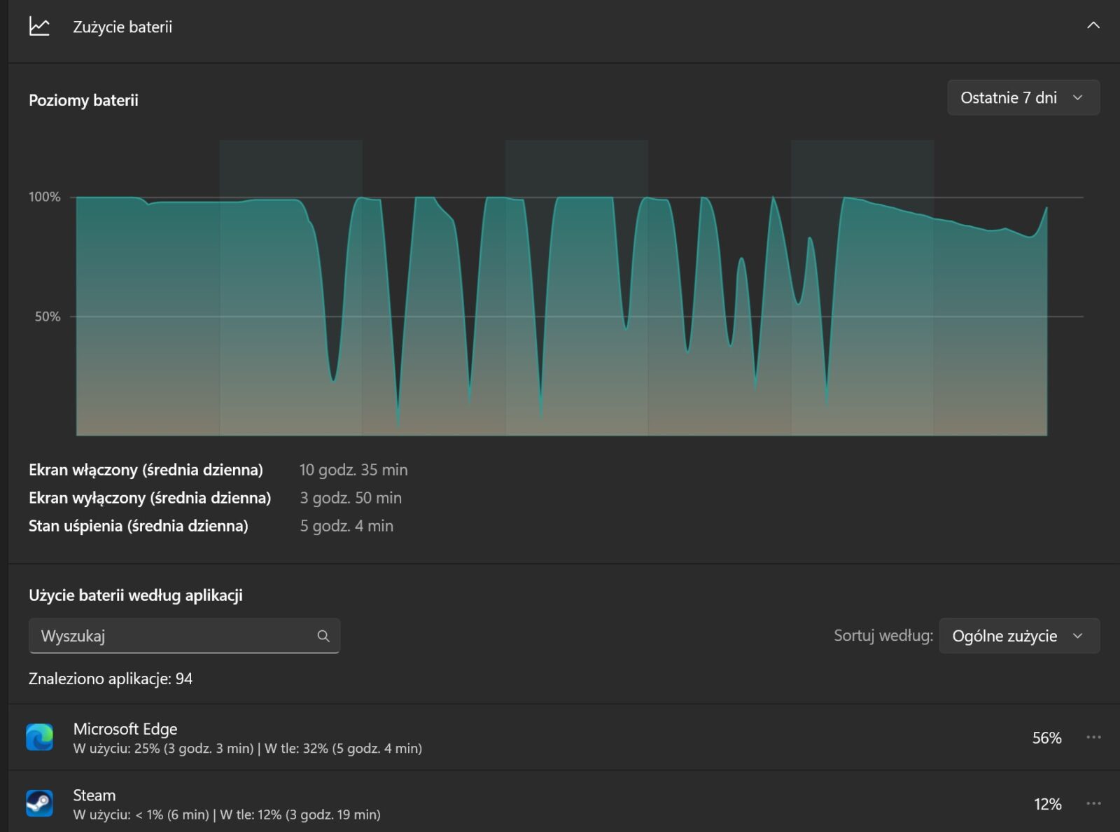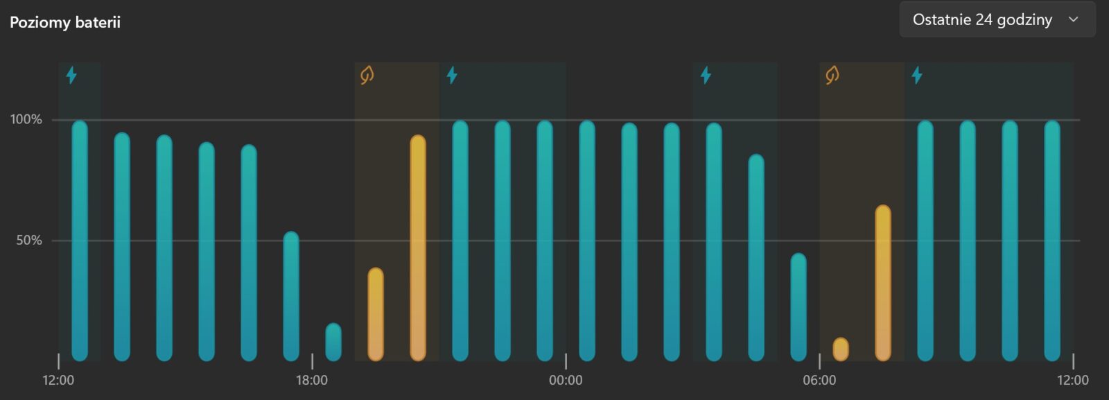 Pomiary realizowałem z aktywnym Wi-Fi 6, Bluetooth, na jasności ekranu lub ekranów rzędu około 30 procent oraz w trybie najwyższej wydajności, a to przez fakt, że przy zasilaniu z akumulatora na trybie zrównoważonym ten sprzęt rozczarowywał mnie swoją responsywnością. Pracować wprawdzie się na nim dało, ale regularne przełączanie się między kartami przeglądarki Edge potwierdzało, że wydajnościową bestią Zenbook Duo UX8406 nie jest, a przynajmniej w momencie, kiedy macie te 20 kart rozłożonych w formie dwóch okien przeglądarki na obu ekranach. Nawet w trybie najwyższej wydajności sprzęt regularnie łapie czkawkę i to nawet bez aktywowanego drugiego ekranu, ale rozwiązaniem tego wydajnościowego problemu jest po prostu wpięcie zasilania, z którym Zenbook Duo UX8406 rozwija skrzydła.