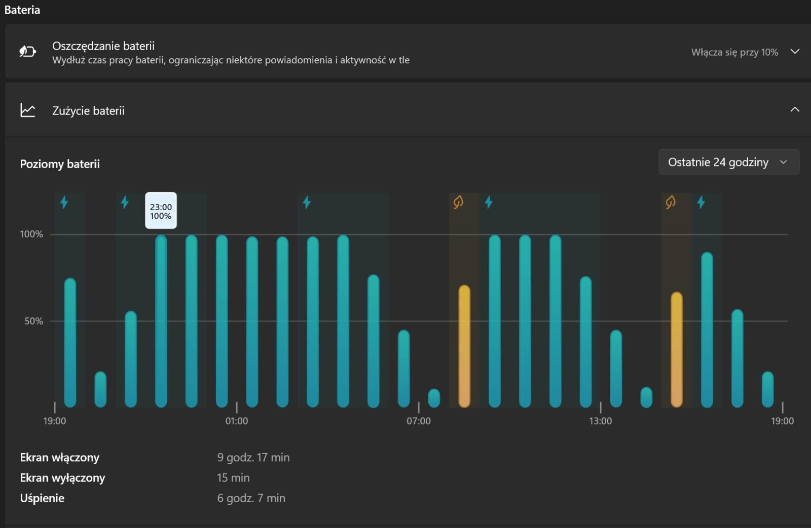 Dwa ekrany o tak imponujących możliwościach w jednym laptopie to coś, co po prostu nie może nie wpływać bardzo negatywnie na zastosowany akumulator. Ten wprawdzie jest duży, jak na tego typu sprzęt, bo jego pojemność sięga 75 Wh, ale nawet dwukrotnie pojemniejsze ogniwo nie byłoby w tym modelu wystarczające na 8-godzinny dzień wydajnej pracy w przeglądarce. Podczas testów, w których Zenbook Duo UX8406 służył mi głównie do researchu i pisania, osiągałem czas średnio około dwóch godzin w trybie z dwoma aktywnymi ekranami (około 45-procentowy spadek na godzinę) i trzech godzin (spadek ~32% na godzinę) w trybie jednego ekranu po naładowaniu do 100%. Samo ładowanie średnio trwało około 90 minut (przy uśpionym laptopie), podczas gdy ładowanie do 80% zajmuje około okrągłej godziny przy wyłączonym laptopie i 90 minut przy pracy na nim w przeglądarce.