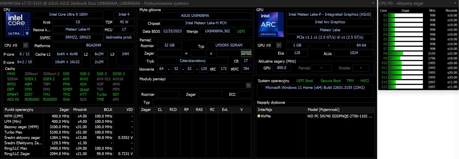 Nie tylko wyświetlacze robią wrażenie w Zenbook Duo UX8406. To samo można powiedzieć o jego specyfikacji, która poza modułem łączności Wi-Fi 6E czy Bluetooth 5.3 obejmuje również wyróżniający się na rynku 32-gigabajtowy zestaw pamięci LPDDR5X (zwykle producenci stawiają na 16-GB pokład RAM), maksymalnie dwa SSD na M.2 PCIe 4.0 oraz 45-watowy (115-watowy, jeśli idzie o MTP) procesor Intel Core Ultra 7 155H lub Core Ultra 9 185H (zależnie od wersji), czyli 16-rdzeniowe i 22-wątkowe CPU, które różnią się tylko taktowaniem (4,8 vs 5,1 GHz w trybie Boost). W przypadku testowanego przeze mnie sprzętu w grę wchodzi konfiguracja z potężniejszym procesorem, dwoma 16-GB modułami pamięci LPDDR5X oraz 2-terabajtowym dyskiem WD SN740, którego na rynku można kupić za około 650 zł.