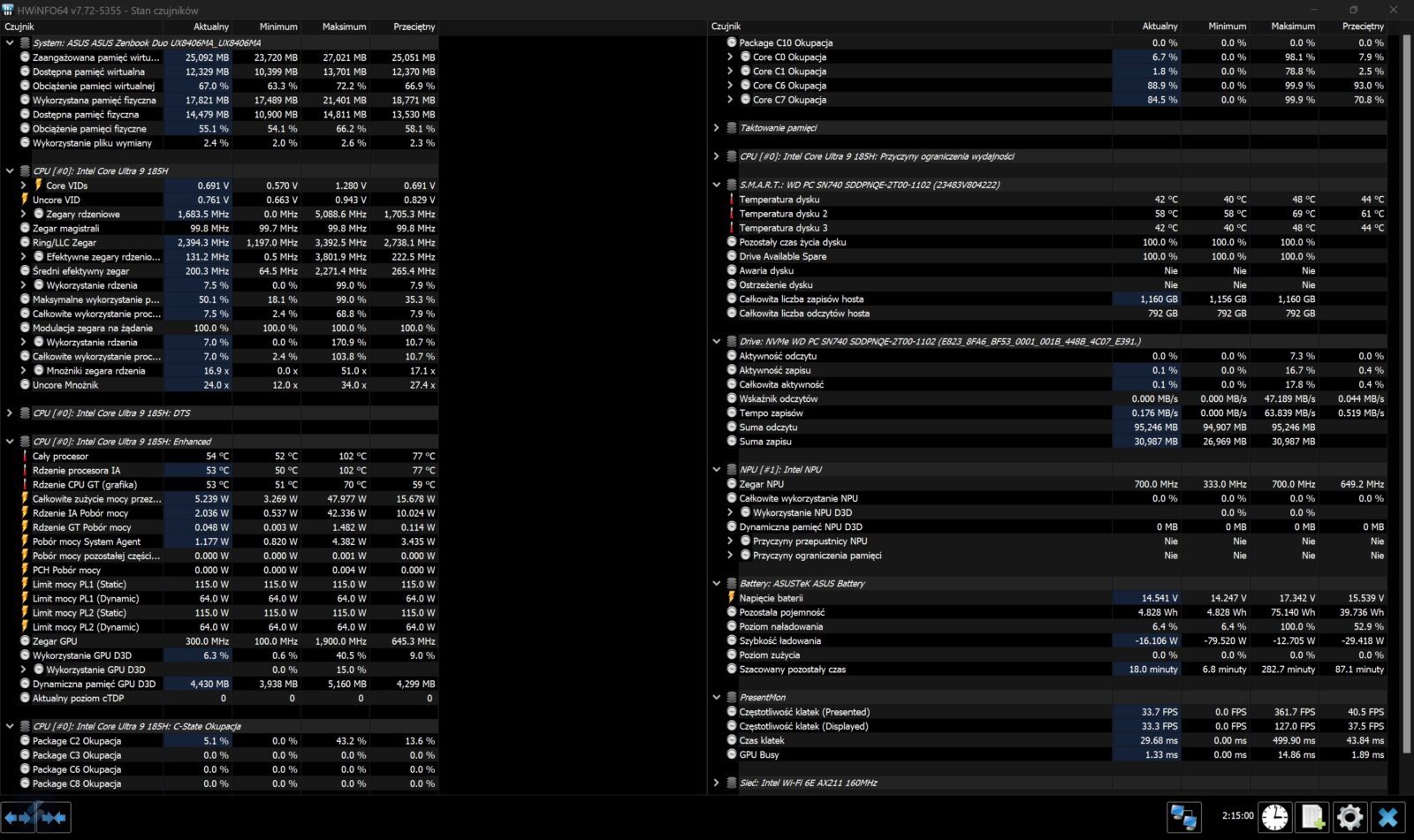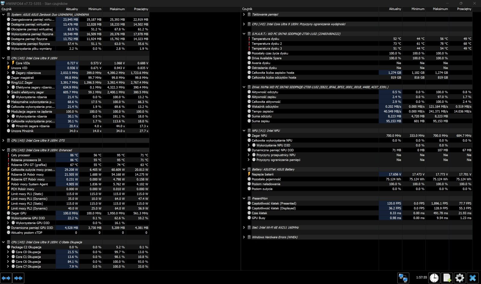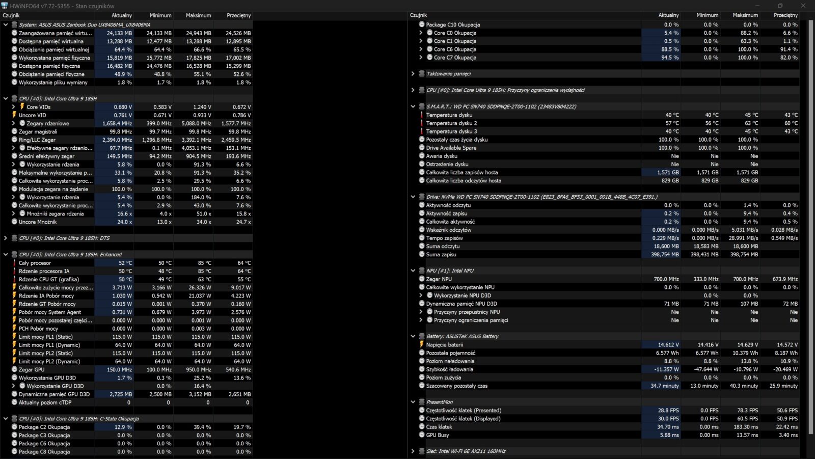 Patrząc na zużycie procesora (C-State), można z łatwością zauważyć, że problem związany z niską wydajnością w trybie akumulatorowym niezależnie od ustawionego trybu, jest ewidentnie spowodowany okupowanymi przez procesor stanami pracy. W ich ramach procesor jest zaprzęgany do pracy w różnym stopniu tak, że C0 jest trybem najwydajniejszym, a kolejne cyfry oznaczają tryby coraz niższej ogólnej wydajności, a tym samym wyższej energooszczędności. Ta z racji dwóch wyświetlaczy najwyraźniej po prostu musi być na wysokim poziomie, bo 75-Wh akumulator w przypadku znacznego obciążenia (maksymalna jasność obu wyświetlaczy z włączonym Wordem na jednym ekranie oraz filmem na YouTube na drugim) pozwala Zenbookowi Duo UX8406 działać przez ponad trzy godziny. Testy w aplikacjach biurowych i PCMark 10 potwierdziły mi z kolei, że nawet obiecane 13,5 godzin na jednym ładowaniu mają sens, ale na bardzo niskim poziomie jasności wyświetlaczy.