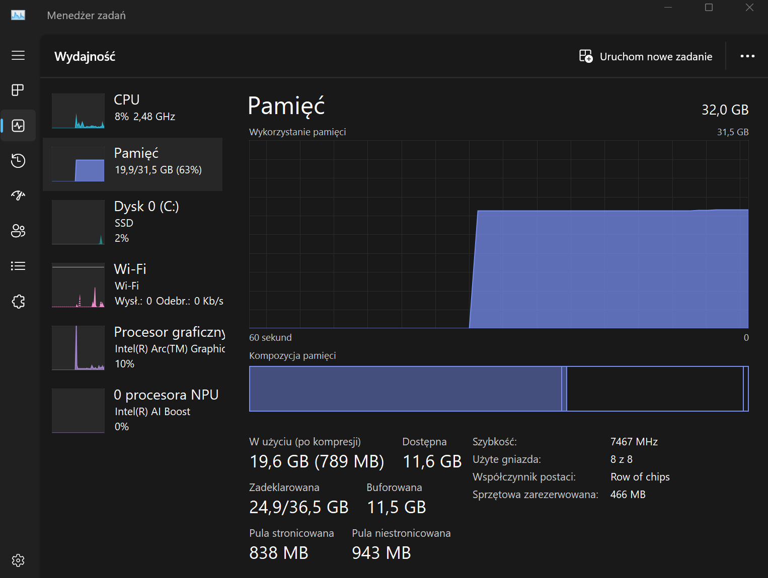Taki zestaw oznacza, że za kwestie graficzne odpowiada wyłącznie obecny w procesorze procesor graficzny Intel Arc z ośmioma rdzeniami Xe, który rozkręca się maksymalnie do 2,35 GHz i wspiera wszystkie najnowsze technologie związane z kartami graficznymi. Ten iGPU “tworzy” sobie VRAM bezpośrednio z pamięci RAM, co nadaje dodatkowego sensu wspomnianym 32 GB LPDDR5X, które do prac biurowych mogą wydawać się przesadą, ale uwierzcie mi – nie są. Zwłaszcza w czasach, w których przeglądarka może pożreć dobre kilkanaście gigabajtów RAM-u. Poza tym Intel wprowadził do tego CPU specjalny układ do obliczeń związanych ze sztuczną inteligencją, czyli NPU AI Boost z 1,4-GHz taktowaniem. W praktyce jednak na ten ostatni układ nie ma co patrzeć, bo przez cały okres testowy w codziennym użytkowaniu system Windows ani razu nie zrobił użytku z tego NPU. To jednak ma zmienić się w przyszłości.