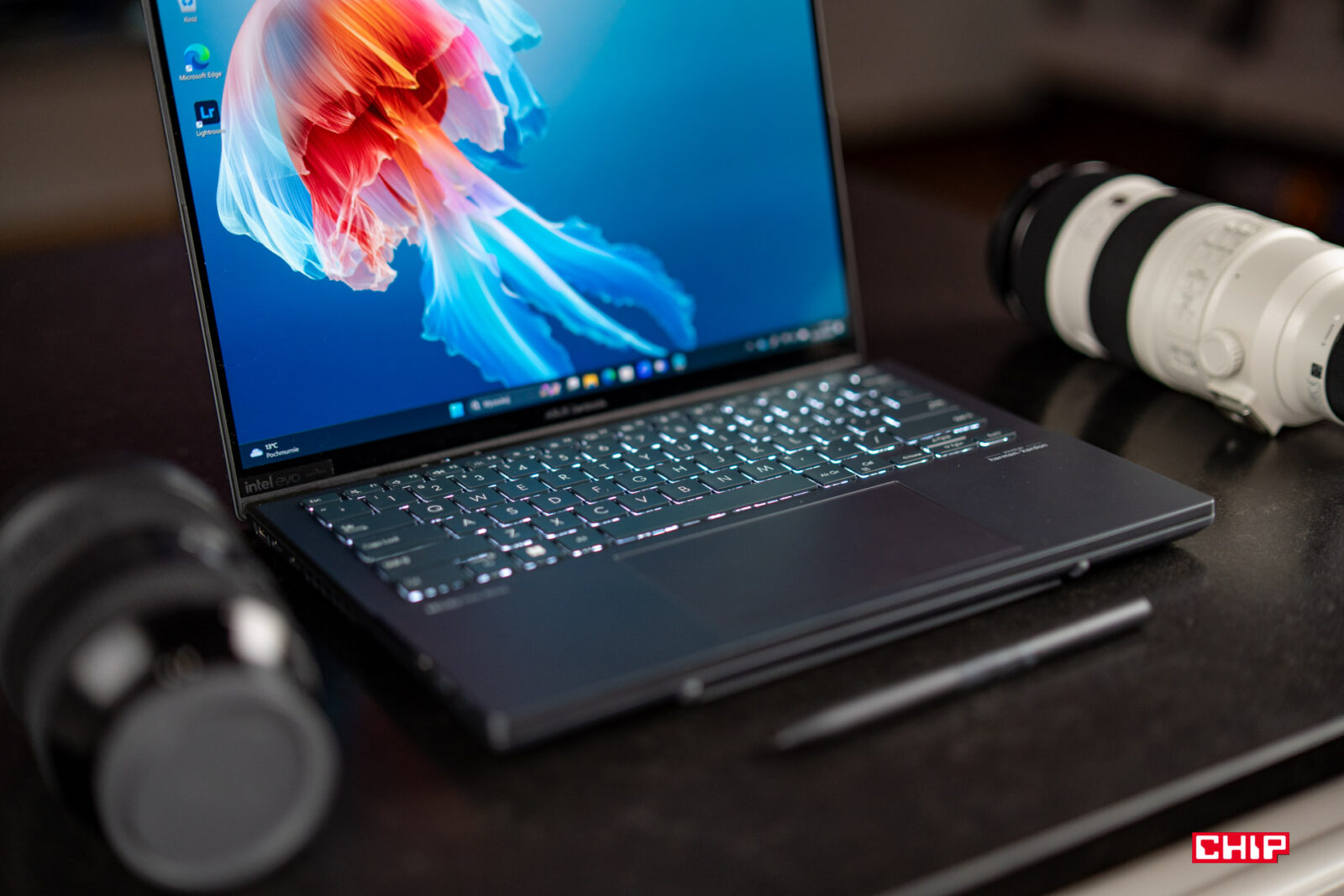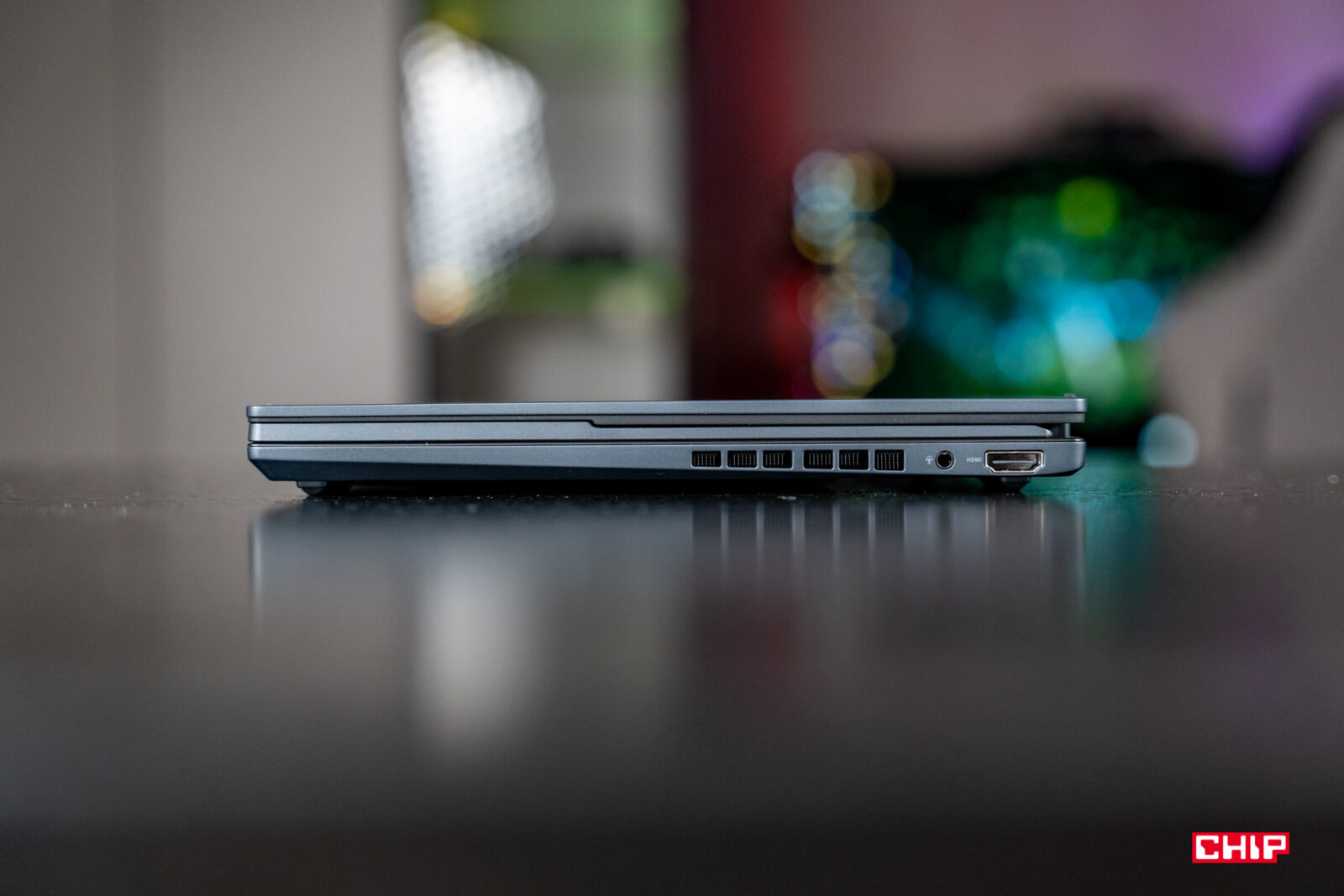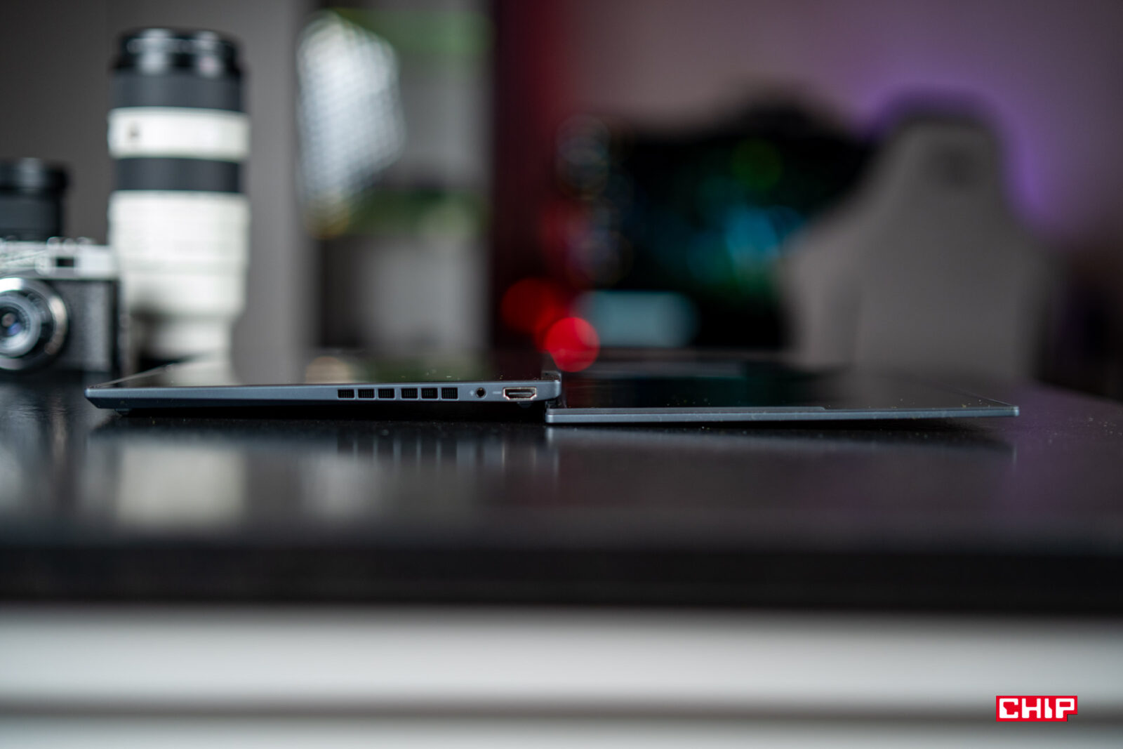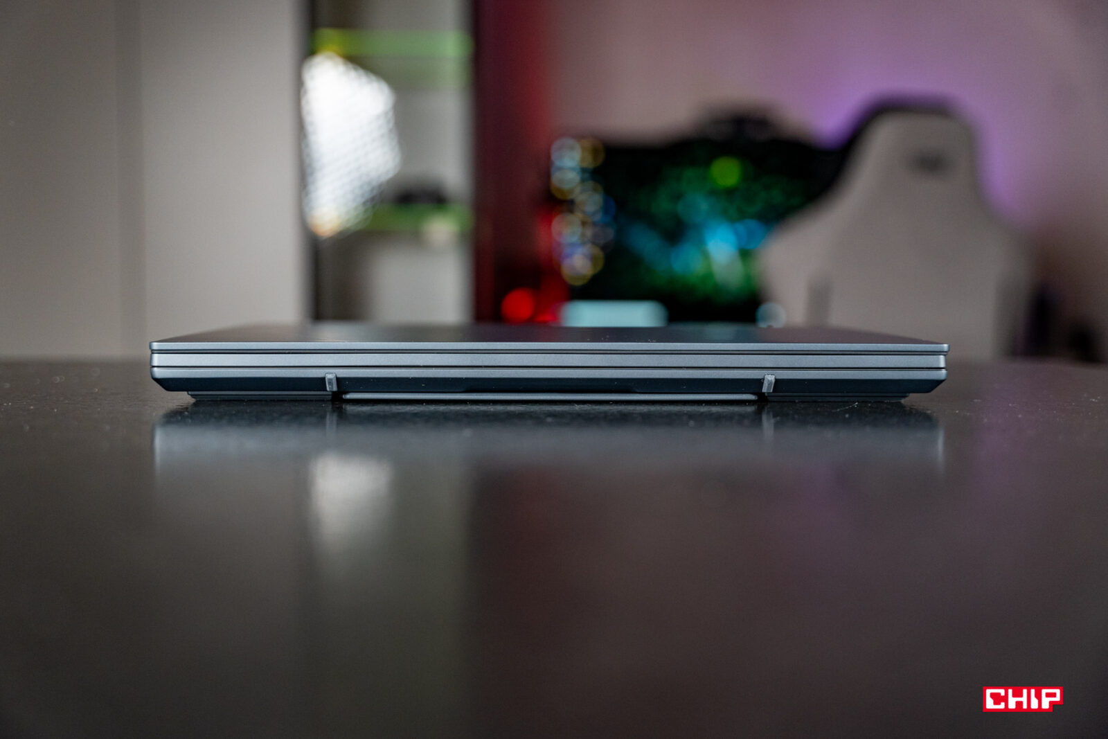 Czy to powinno nas dziwić, jak na 22-rdzeniowy procesor z 32 GB LPDDR5X? Na pewno nie, o ile wiemy, że wśród tych rdzeni znajduje się sześć pełnoprawnych rdzeni Performance skupionych na zapewnianiu maksymalnej wydajności, 8 rdzeni Efficient o lepszym stosunku efektywności energetycznej do obliczeniowej oraz dwa rdzenie Efficient o jeszcze mniejszej prądożerności i tym samym wydajności. Z drugiej strony w zamian otrzymujemy rzeczywiście energooszczędnego laptopa, którego system chłodzenia nawet na najwyższym obciążeniu szumi tak, jak pokojowy wentylator ustawiony na najniższym, a nie najwyższym poziomie prędkości (głośniki na 25 procentach głośności przebijają generowany przez niego hałas).