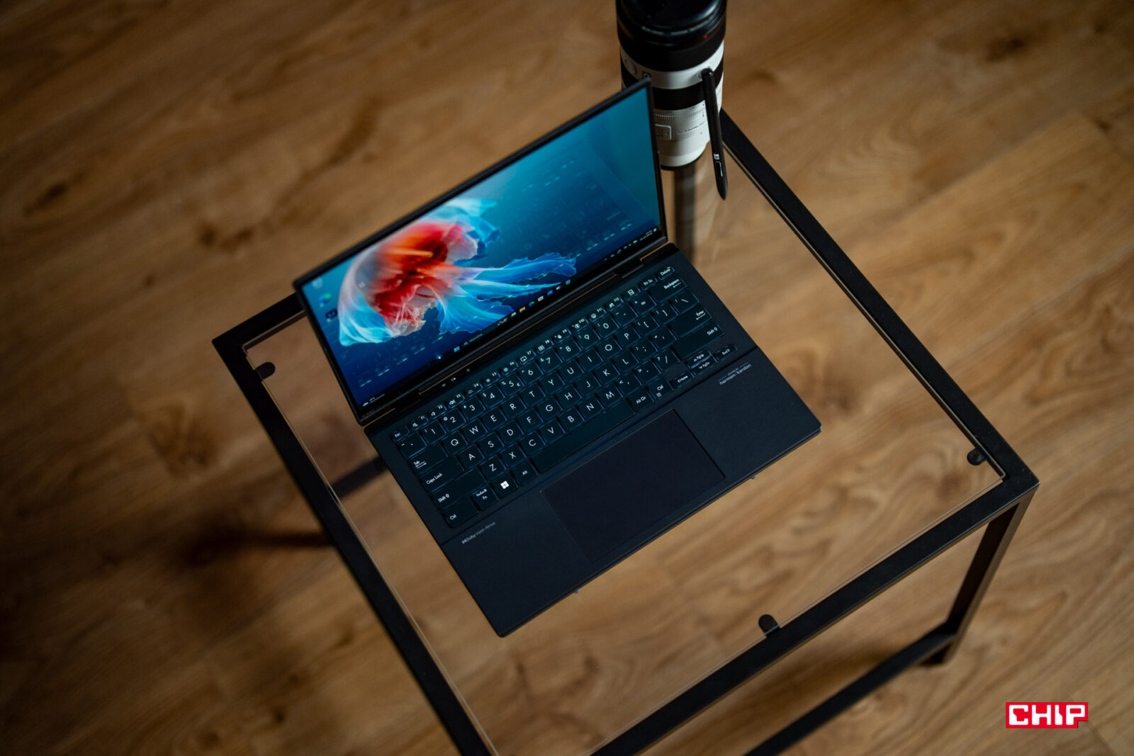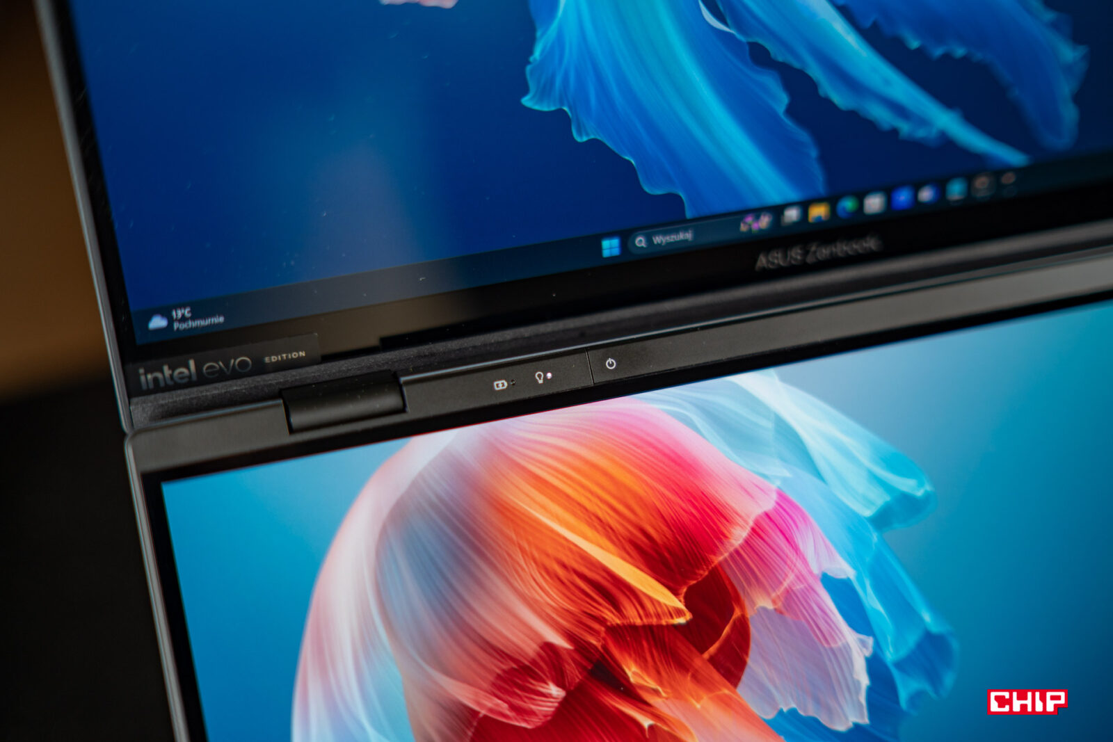 Na górnej krawędzi głównego ekranu znalazły się dwa mikrofony, czujnik światła, kamera Full HD oraz czujnik podczerwieni, czyli duet, który umożliwia szybkie działanie funkcji Windows Hello. Z kolei nad górną krawędzią dodatkowego ekranu znalazł się przycisk on/off oraz dwie diody funkcyjne, z czego jedna zapewnia informację na temat aktualnego stanu akumulatora. Znacznie więcej ciekawych rozwiązań można znaleźć w preinstalowanym oprogramowaniu, które obejmuje aplikację MyAsus w formie centrum dowodzenia, GlideX do m.in. zdalnego dostępu oraz ScreenXpert.