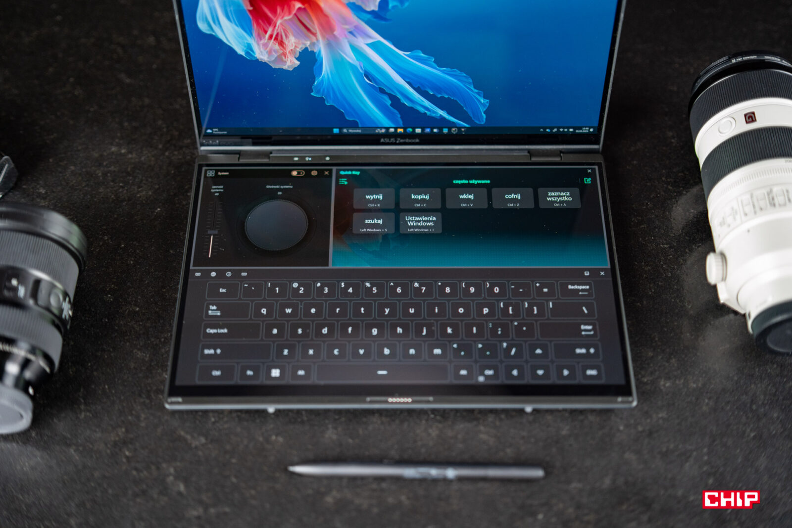 Po obróceniu o 90 stopniu i delikatnym przymknięciu laptopa zapewniacie sobie “tryb desktopowy”, czyli po prostu dwa wertykalne ekrany. Treść na drugim ekranie możecie też łatwo odwrócić o 180 stopni, co jest szczególnie przydatne w trybie prezentacji po całkowitym otwarciu pokrywy. Gdyby tego było mało, ekran pod klawiaturą może pełnić rolę w pełni cyfrowej klawiatury i touchpada właśnie, bo można odpalić na nim specjalną nakładkę. Sensu wprawdzie w tym ostatnim specjalnie nie widzę, ale za to dostrzegam potencjał w konfiguracji tego laptopa z opcjonalnym rysikiem ASUS Pen 2.0 z 4096 poziomami nacisku, który może posłużyć do tworzenia cyfrowych grafik. Musicie bowiem pamiętać, że oba ekrany Zenbook Duo UX8406 (2024) ukryte pod błyszczącą, a nie matową matrycą, są dotykowe.