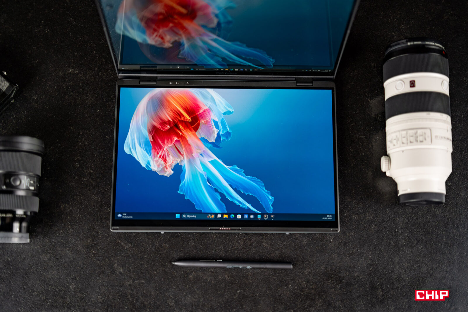 Przepiękna animowana tapeta przedstawiająca płynącą meduzę – to wita nas na samym początku przygody z Zenbook Duo UX8406 i jednoznacznie świadczy o fenomenalnej wręcz jakości zastosowanych ekranów o 91-procentowym pokryciu paneli. Mowa o dwóch 14-calowych matrycach OLED o rozdzielczości 2880 x 1800 (3K), 120-Hz odświeżaniu, 0,2-ms opóźnieniu oraz jasności nominalnej 400 nitów i tej maksymalnej na poziomie 500 nitów (HDR). Są dotykowe, pokrywają 100% palety DCI-P3, cechują się kontrastem 1000000:1, wyświetlają 1,07 mld kolorów, a do tego doczekały się walidacji Pantone oraz certyfikatu VESA HDR True Black 500.