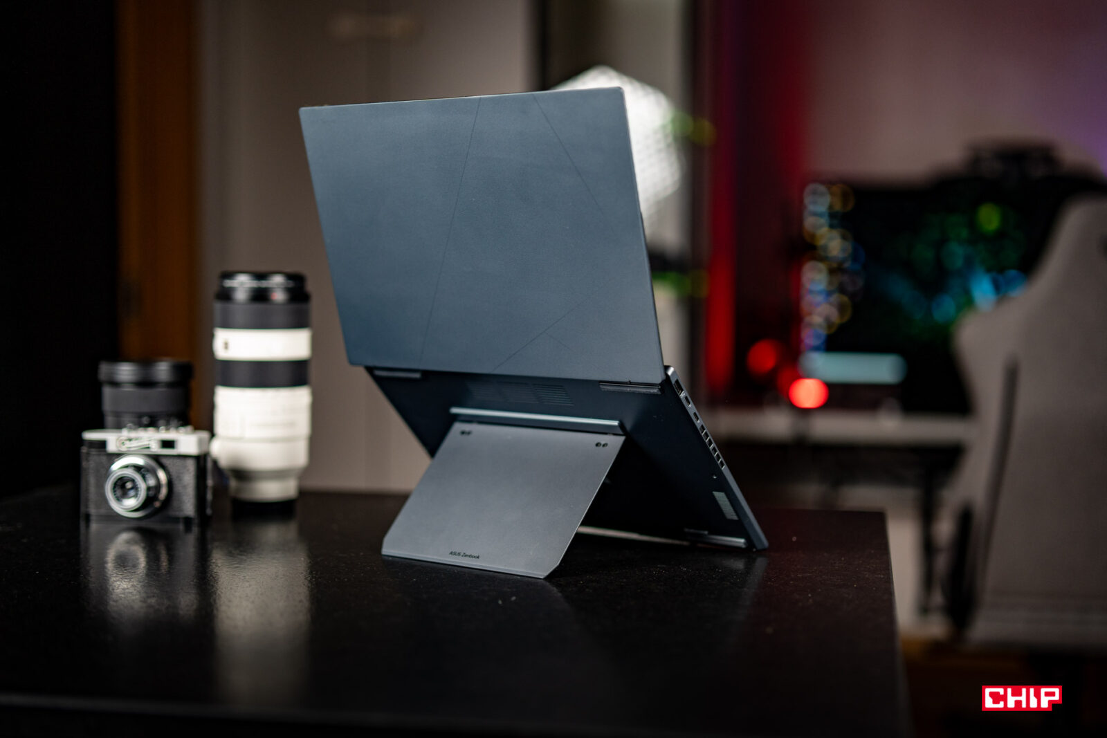 Zdjęcia mówią wszystko. Zenbook Duo UX8406 (2024) to nie tradycyjny laptop, a coś w rodzaju sprzętu nie 2w1 i nawet nie 3w1, a “wiele w jednym”. Z podstawowej konfiguracji może pełnić rolę typowego notebooka (opcjonalny pokrowiec i tekturowa podkładka pozwalają uzyskać bardziej ergonomiczną pozycję), ale wystarczy tylko zdjąć jego klawiaturę przyczepioną na kilka mocnych magnesów, aby zapewnić sobie coś w rodzaju stanowiska z dwoma monitorami i oddzielną klawiaturą. Wtedy solidna podpórka z tyłu okazuje się na wagę złota, bo dzięki niej możemy uzyskać stabilną konfigurację w szeregu różnych pozycji. To jednak nie wszystko.