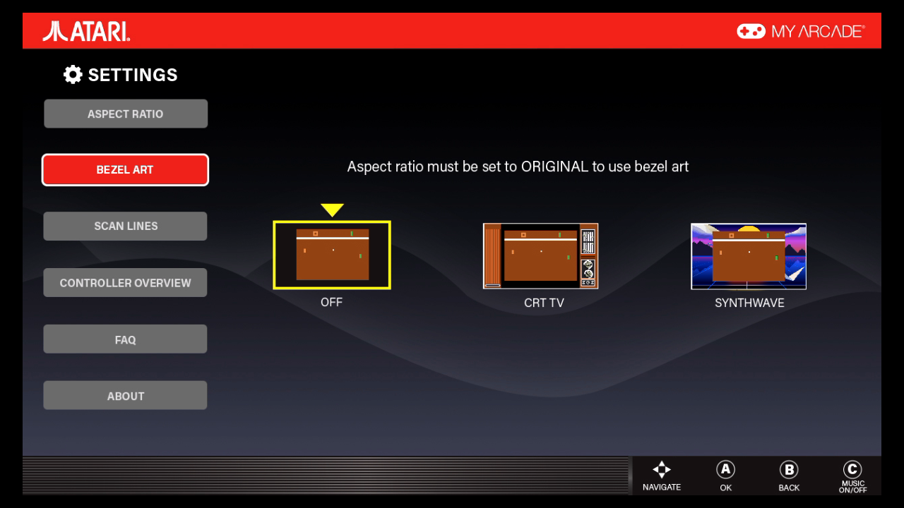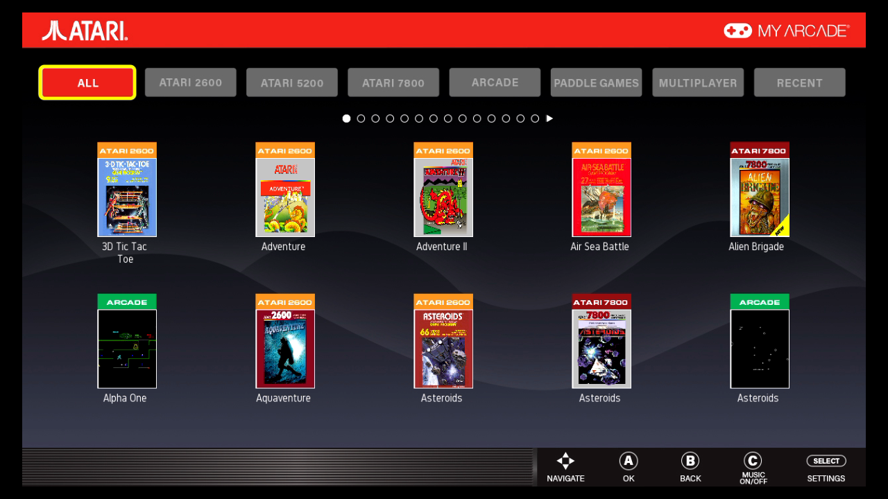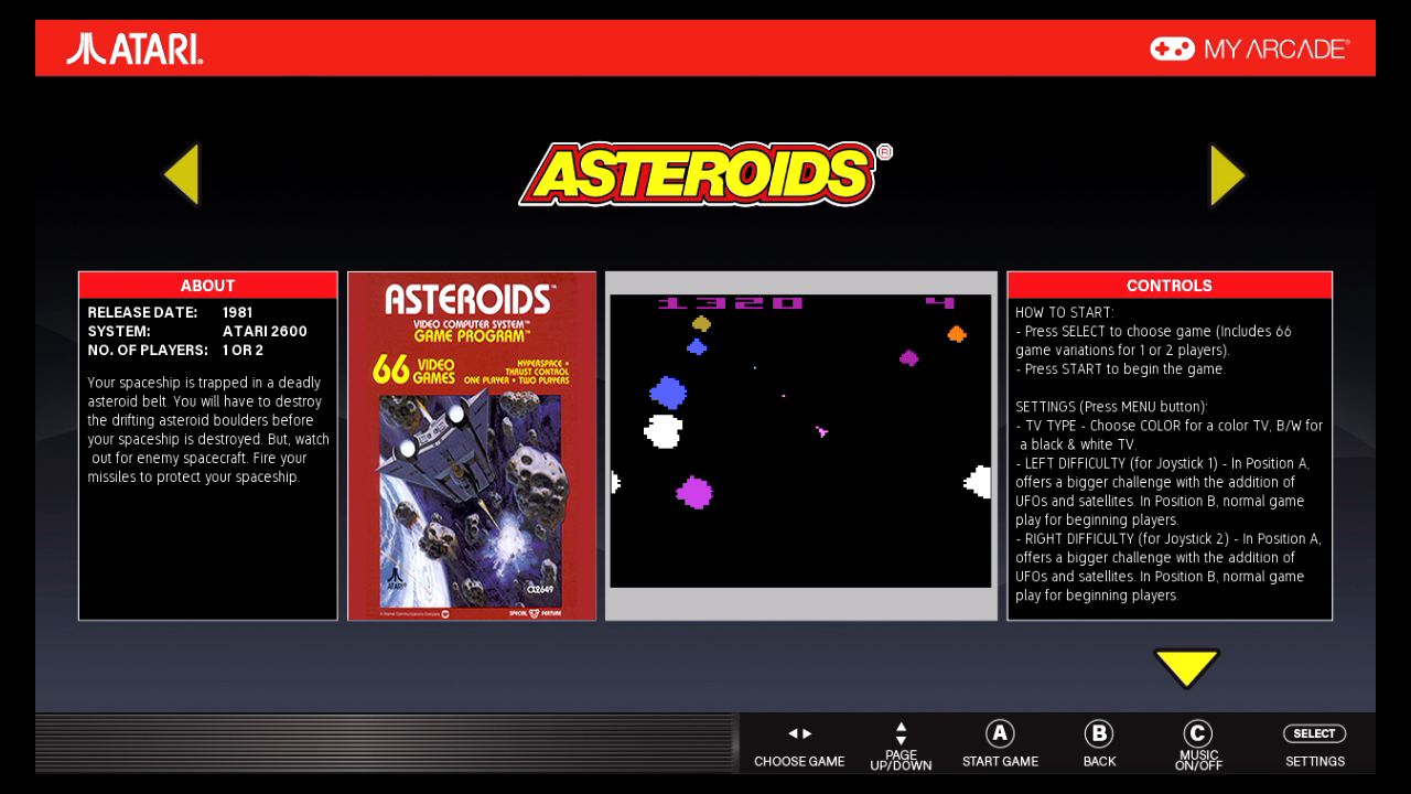 Gry zostały uszeregowane według platformy (Atari 2600, Atari 5200, Atari 7800), a następnie pojawiają się sekcje gier znanych z automatów, gry z obsługą pokrętła (Paddle Games) a na końcu gry dla wielu graczy (Multiplayer). Każda z gier ma swój opis, okładkę, a także zdjęcie przedstawiające zrzut ekranu z rozgrywki. Konsola pozwala na zapis stanu poszczególnych gier, więc w dowolnym momencie można będzie wrócić do takiego zapisanego stanu w późniejszym czasie. Tu przychodzi z pomocą port dla kart microSD, który pozwala zapisać dużo więcej stanów gry, a za sprawą aktualizacji oprogramowania zyskał niedawno nowe możliwości i stanowi jeden z mocnych punktów konsoli My Arcade.