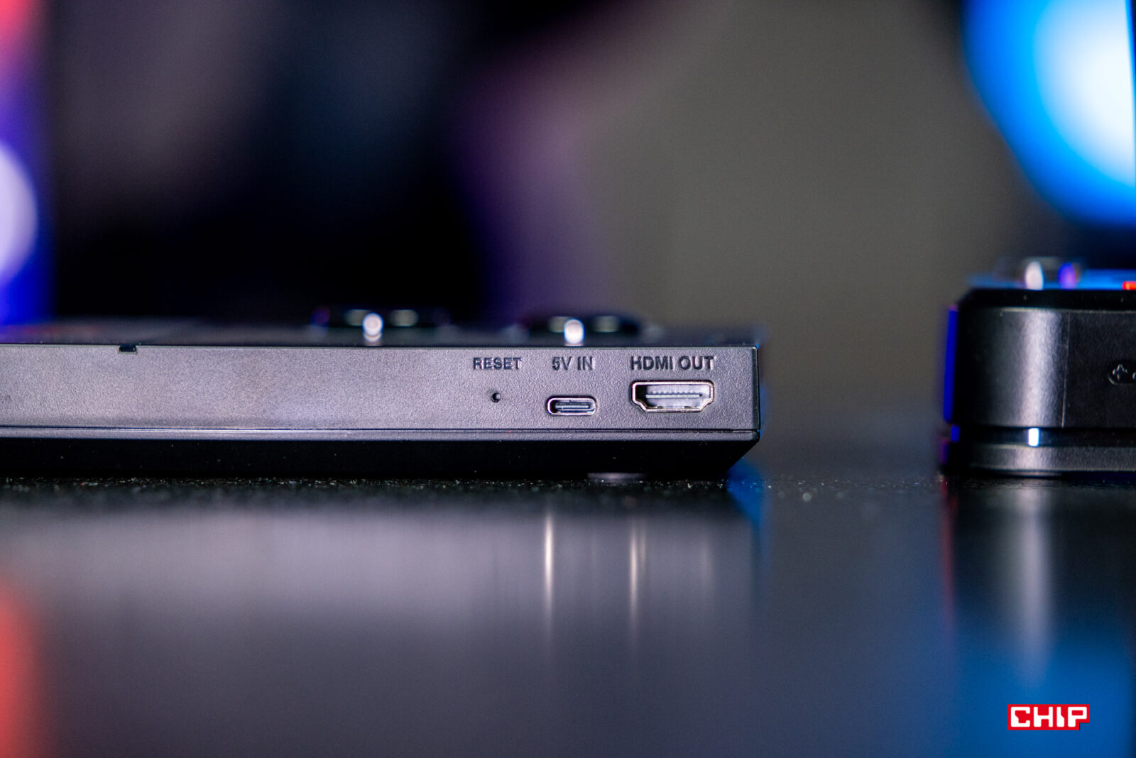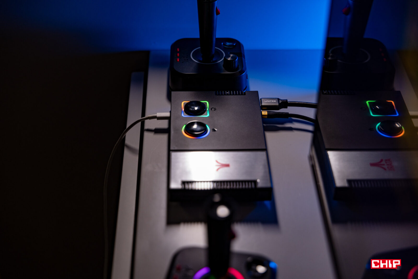 Na obudowie znajdują się jeszcze dwa dodatkowe porty USB-C i są one przeznaczone do kablowego połączenia z joystickami znajdującymi się w zestawie. Te mogą się również komunikować bezprzewodowo z konsolą na paśmie radiowym 2,4 GHz, ale każdy z nich wymaga do tego czterech baterii typu AA. Same joysticki przywołują mnóstwo skojarzeń z minioną epoką – znalazło się w nich nawet miejsce na pokrętło (tzw. paddle), znane z pierwszych gier stacjonarnych typu Pong. Trzy większe przyciski (A, B i C) uzupełnia zestaw mniejszych (Home, Select, Start), a na boku widać jeszcze przycisk włącznika i menu sterującego podświetleniem RGB, które jest synchronizowane z podświetleniem na konsoli.