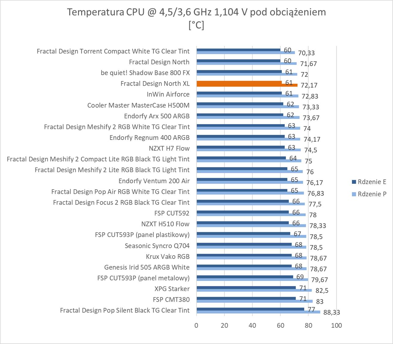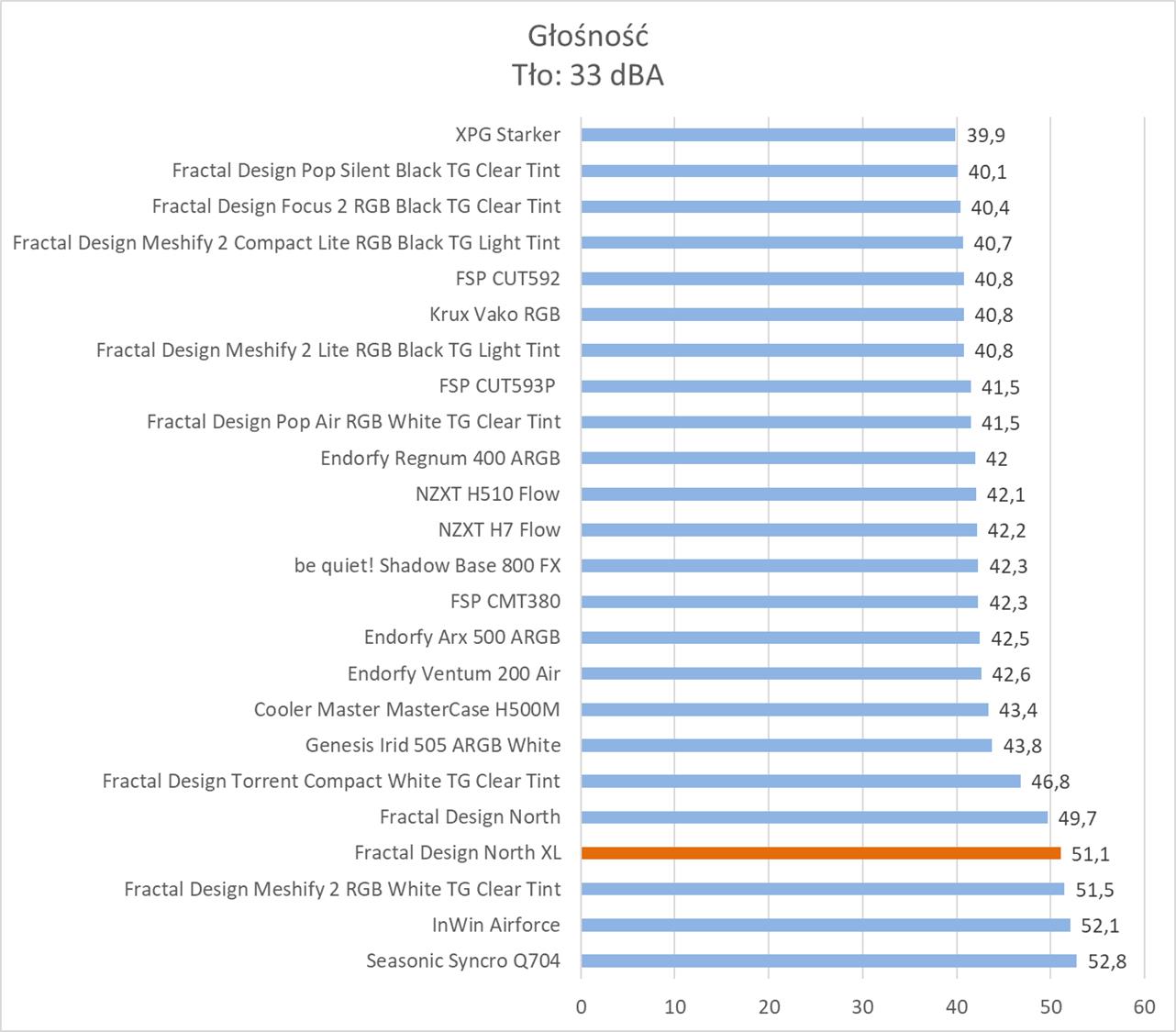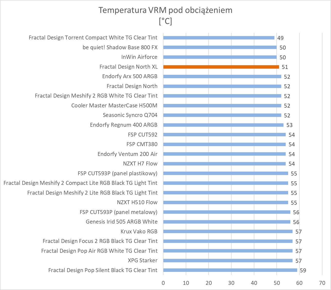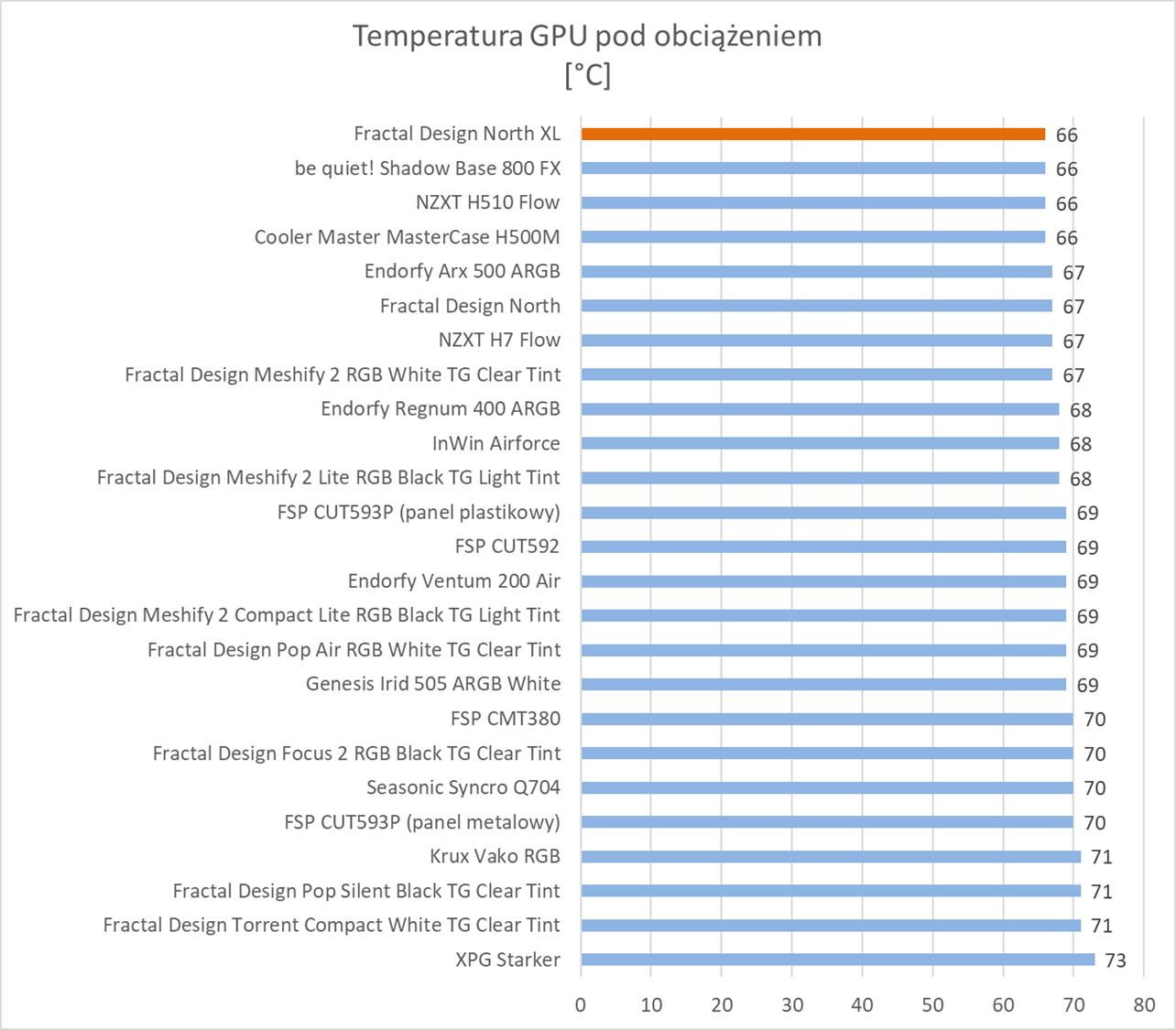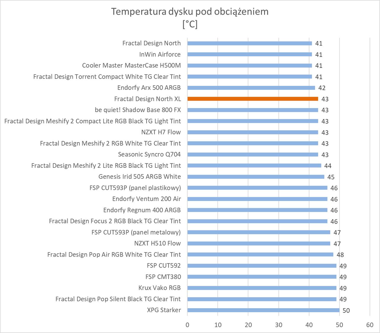 Wyniki są znakomite. Obudowa plasuje się w czołówce wszystkich konstrukcji zapewniają znakomite warunki do pracy każdej z części. Trzy przednie wentylatory sprawdzają się w praktyce, pozytywnie na wyniki wpływa z pewnością też bok wykonany z siatki mesh. Spokojnie możecie w Fractal Design North XL składać najwydajniejszy sprzęt nie bojąc się o temperatury.