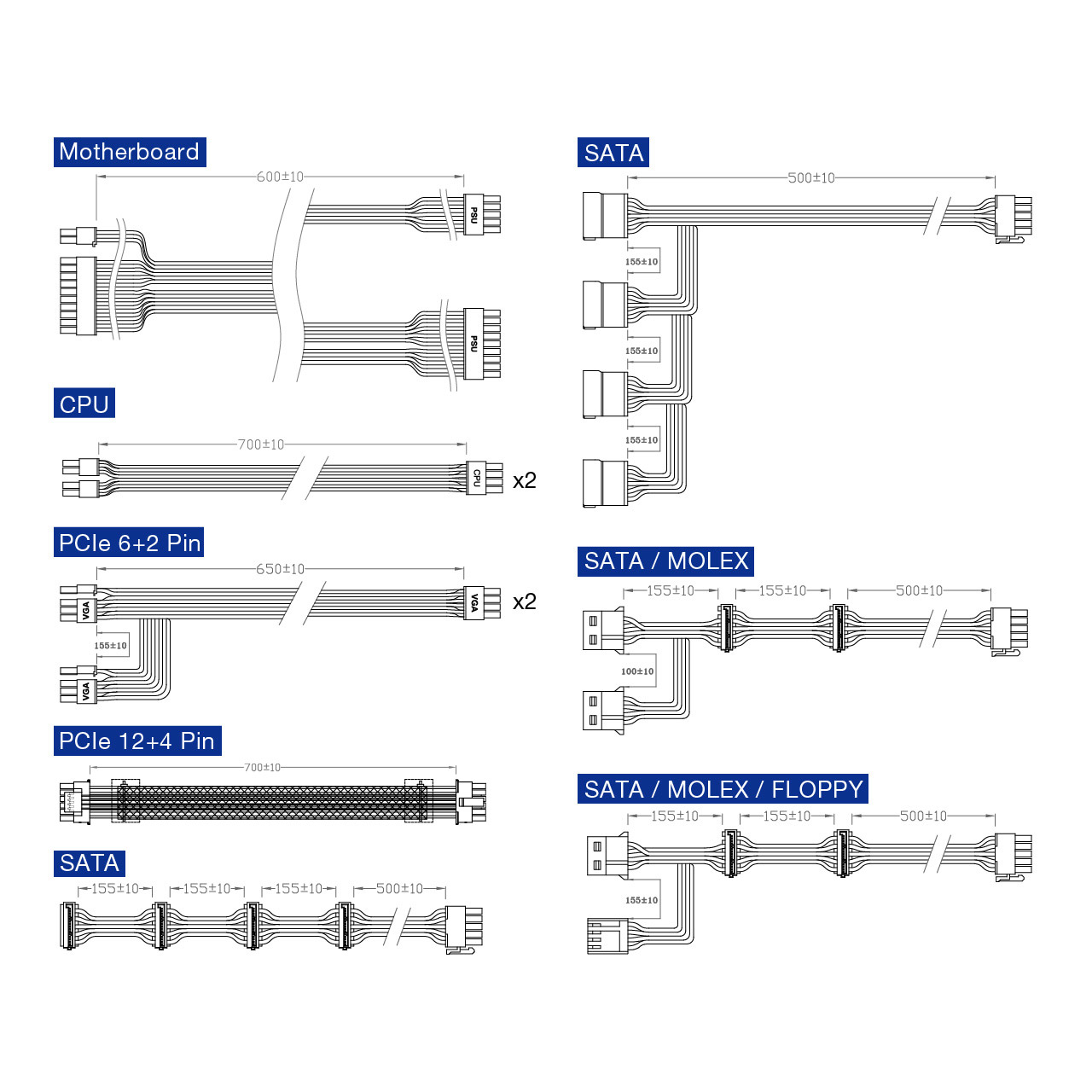Okablowanie najlepiej prezentuje screen po prawej stronie. Jego długość jest odpowiednia i spokojnie wszędzie sięgniecie. Plus należy się za mieszane wiązki SATA i Molex. Minus za tylko dwa kable PCIe – liczyłbym tutaj na trzy takie kable. Poza tym mamy 12VHPWR o mocy 600 W czy dwa EPS 4+4-pin. Prawie całe okablowanie ma płaski profil i jest naprawdę elastyczne. Nie powinno być tutaj problemów z jego podpięciem i odpowiednim ułożeniu w obudowie. Wyjątkiem jest 12VHPWR, który znajdziemy w oplocie. Część w oplocie jest bardzo elastyczna, ale końcówek praktycznie nie da się wygiąć. Ma to uniemożliwić zginanie kabla wcześniej niż jest to zalecane. Poza tym konfiguracja SATA i Molex jest odpowiednia i wystarczająca do większości zestawów.